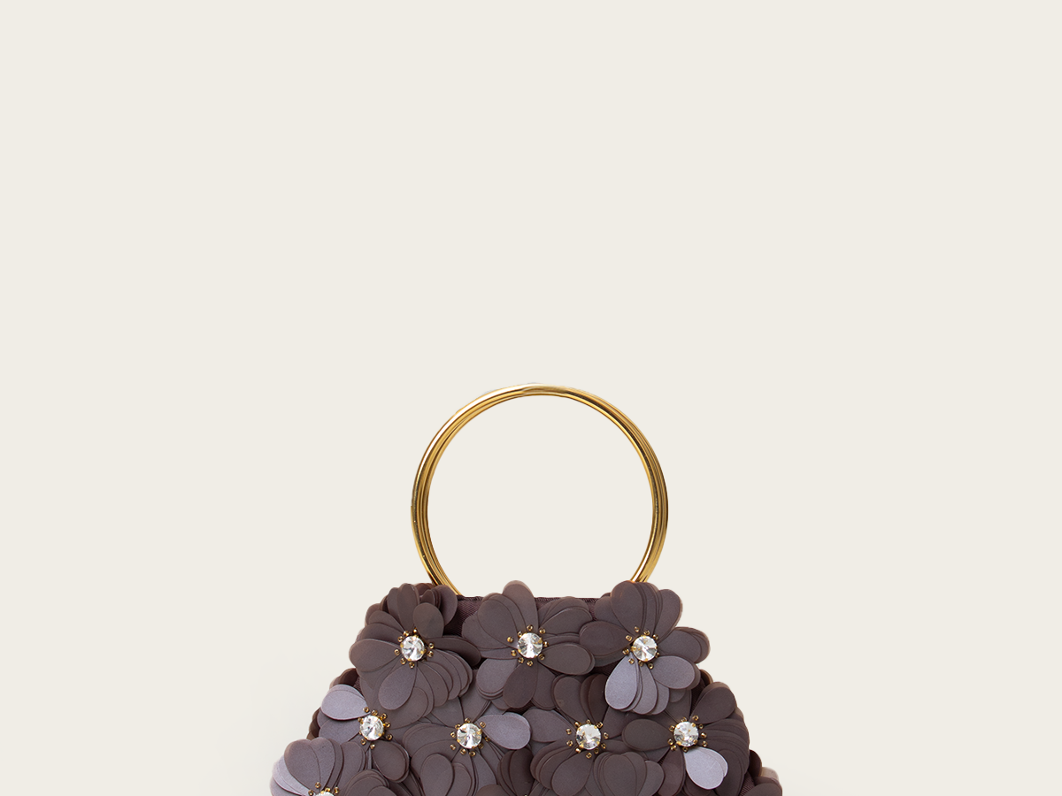 Handcrafted with iridescent sequins blooming around sparkly crystals, this structured piece features a gold handle and brings an interesting three-dimensional texture.