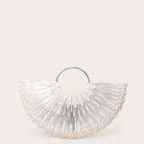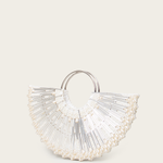 An arch-shaped handbag, crafted with delicate pearls of various shapes, with a sleek circular handle. Its intricate silver and gold beading creates a subtle, radiant sparkle, perfect for an elegant touch.