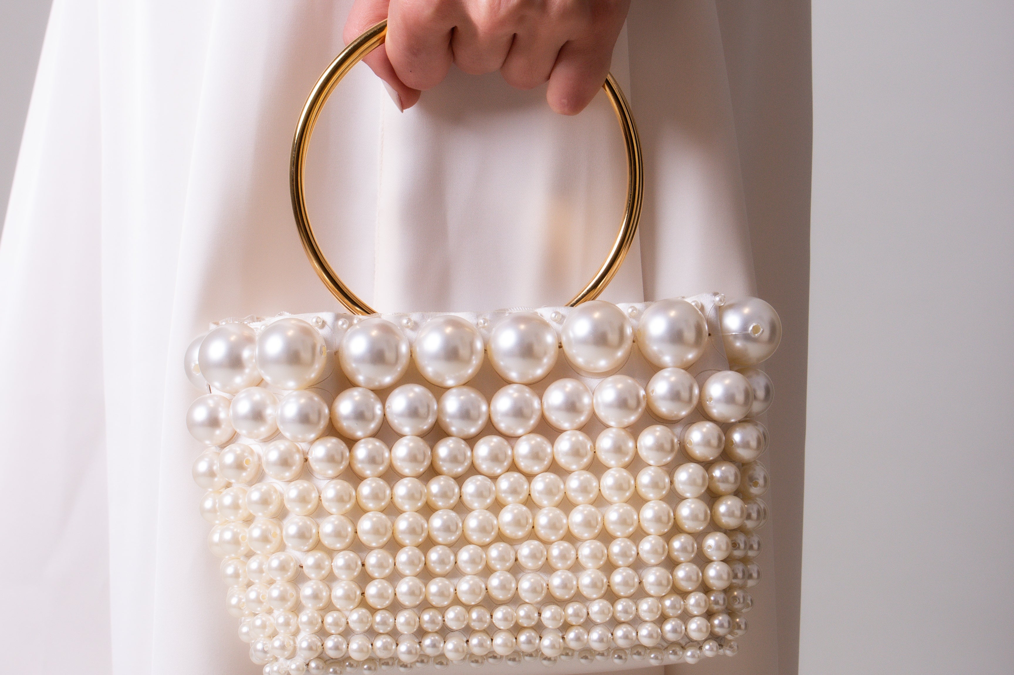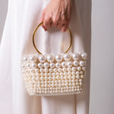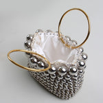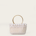 A basket shaped design handcrafted with cascading glossy acrylic pearls. It features a gold- plated circular handle for a geometric and structured appearance.