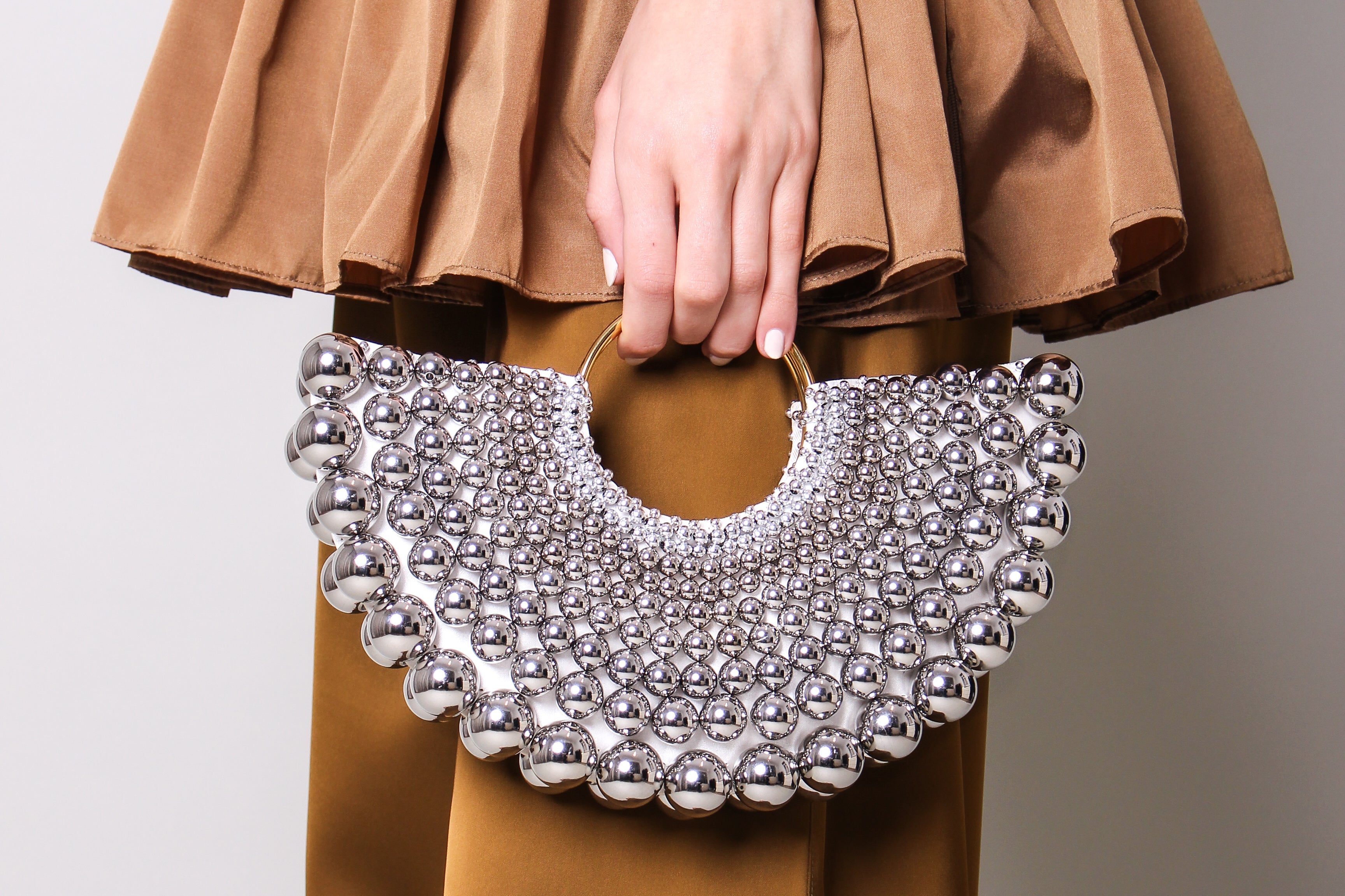 A fan-shaped design handcrafted with cascading glossy acrylic pearls. It features a gold- plated circular handle for a geometric and structured appearance.
