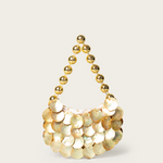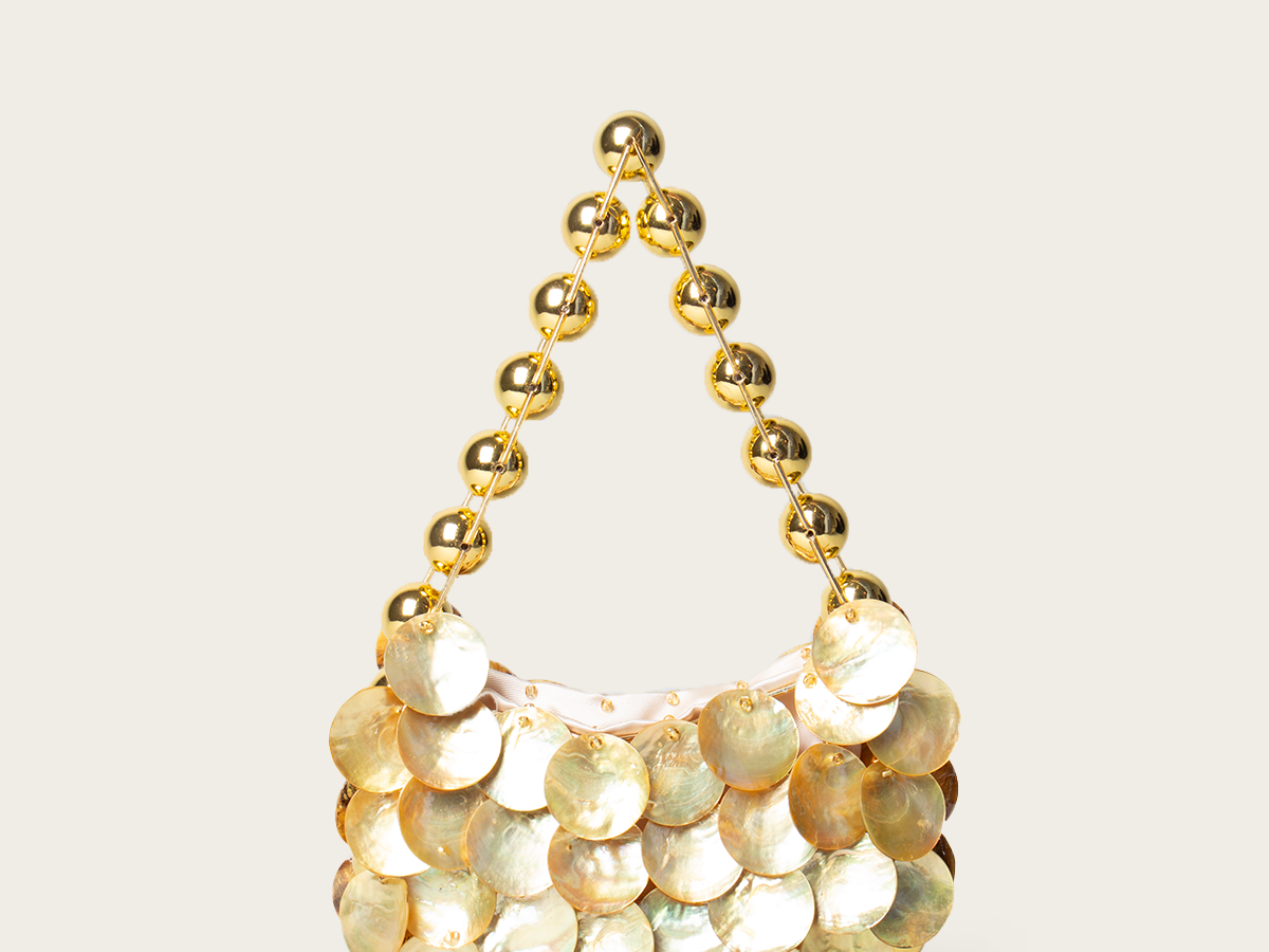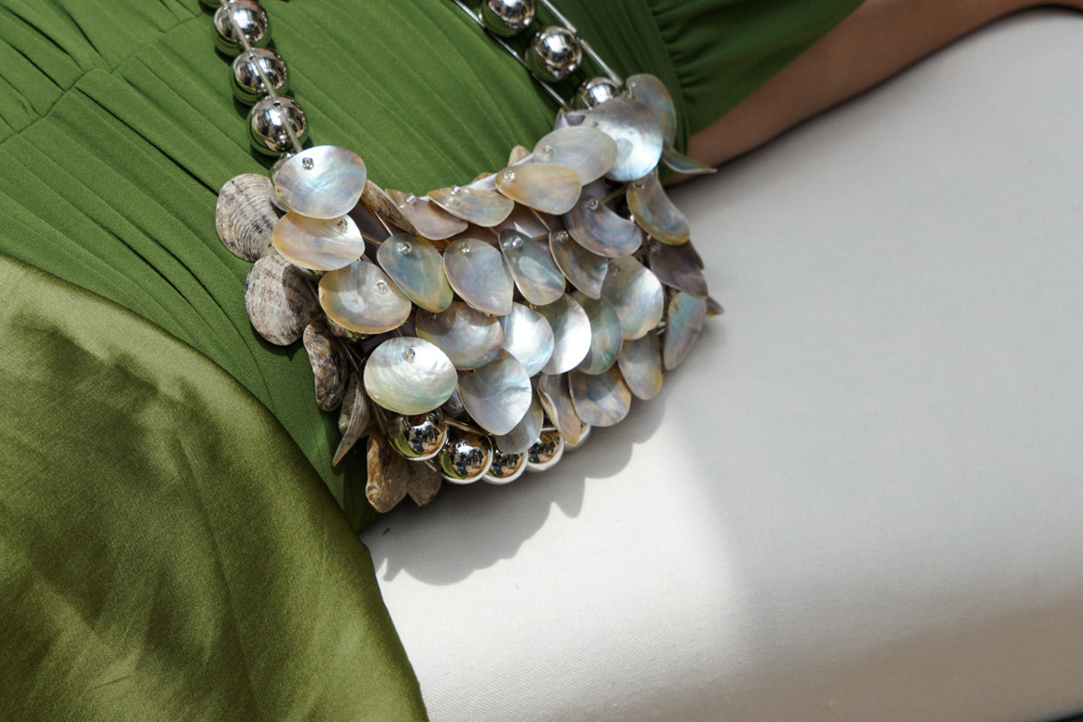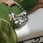 A whimsical piece fully adorned with natural iridescent natural shells that gently jiggle. It is supported by a beaded strap highlighted by glossy beads.