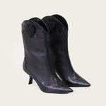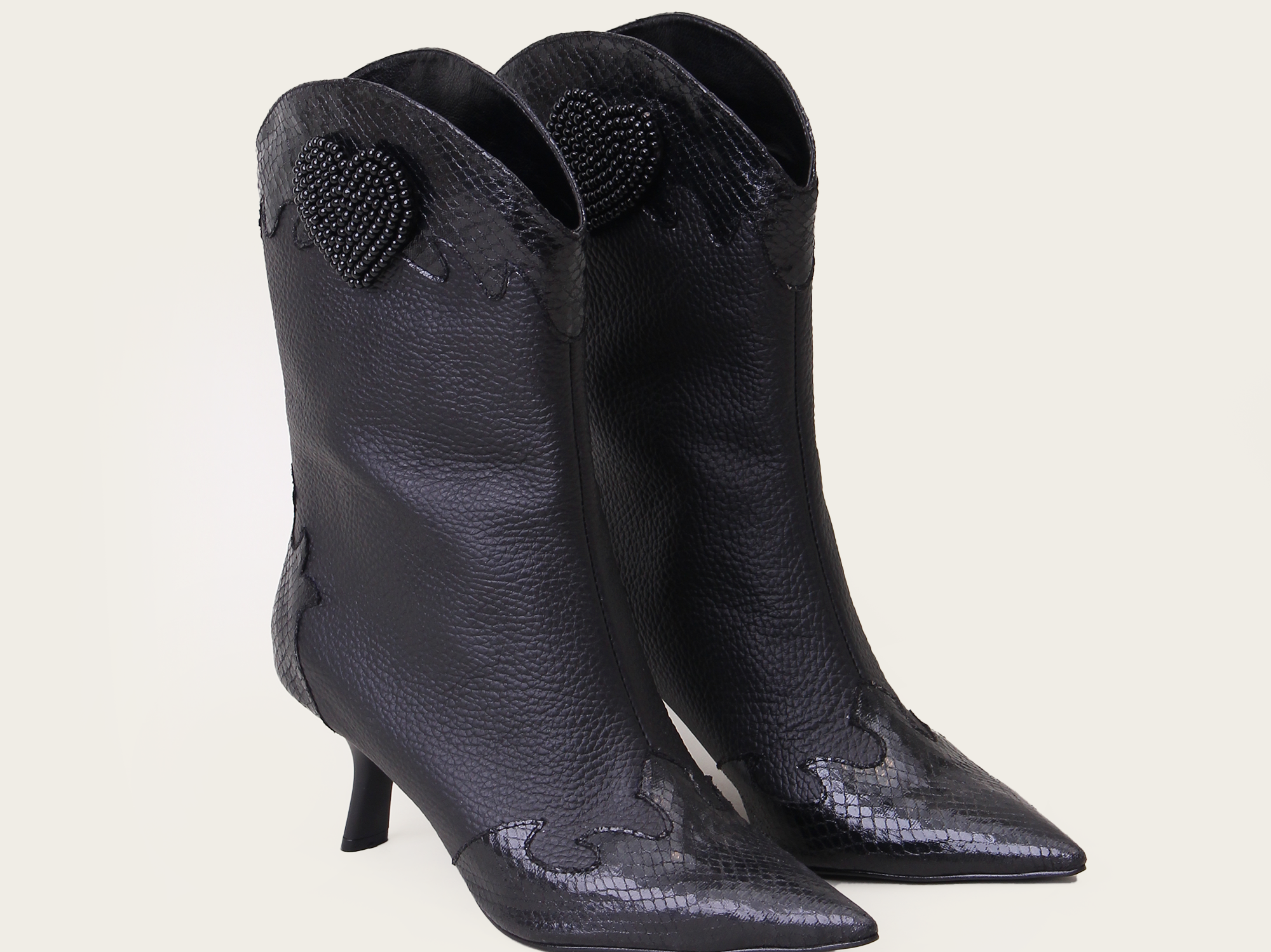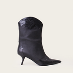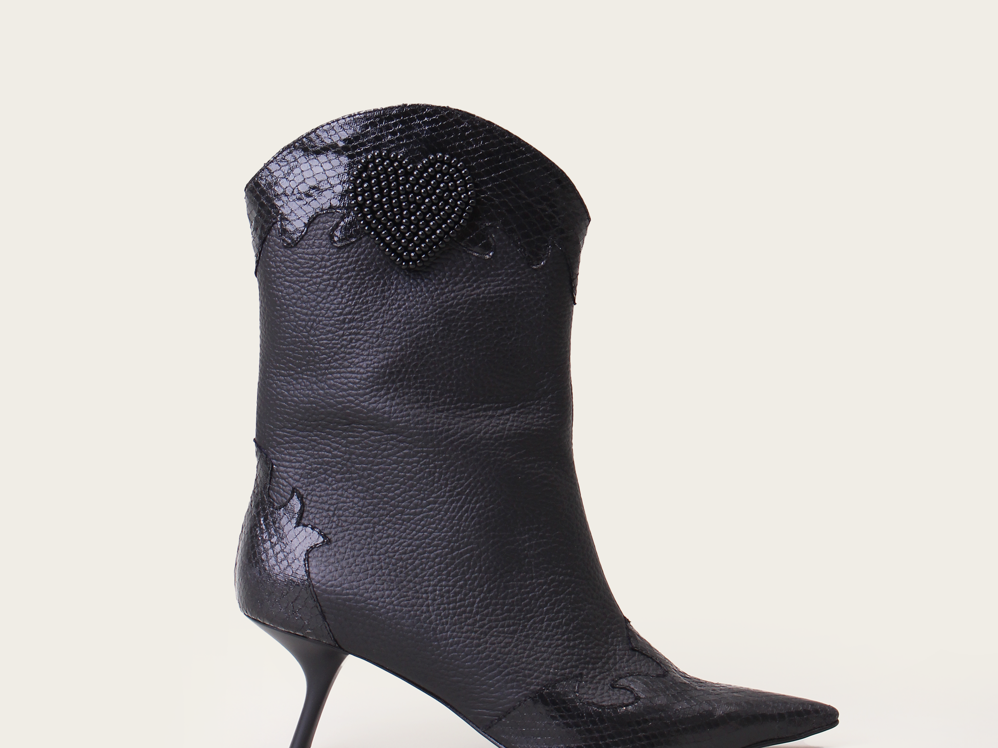 A western-inspired mid-calf boot with a pointy toe. It features a two-toned color scheme with textured and smooth leather detailing. This striking contrast is balanced with a beaded heart, adding a contemporary flare.