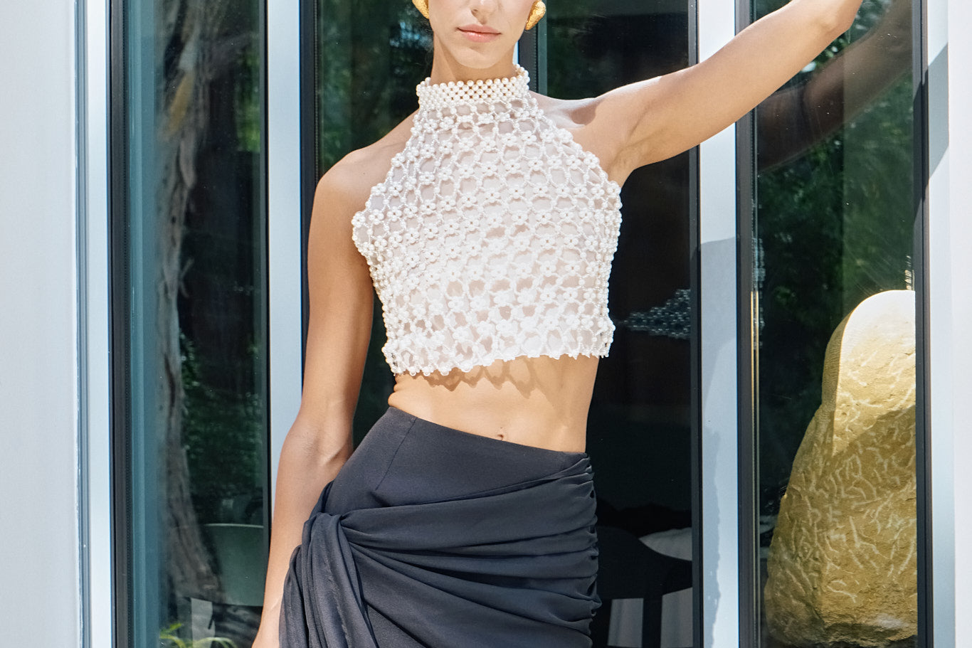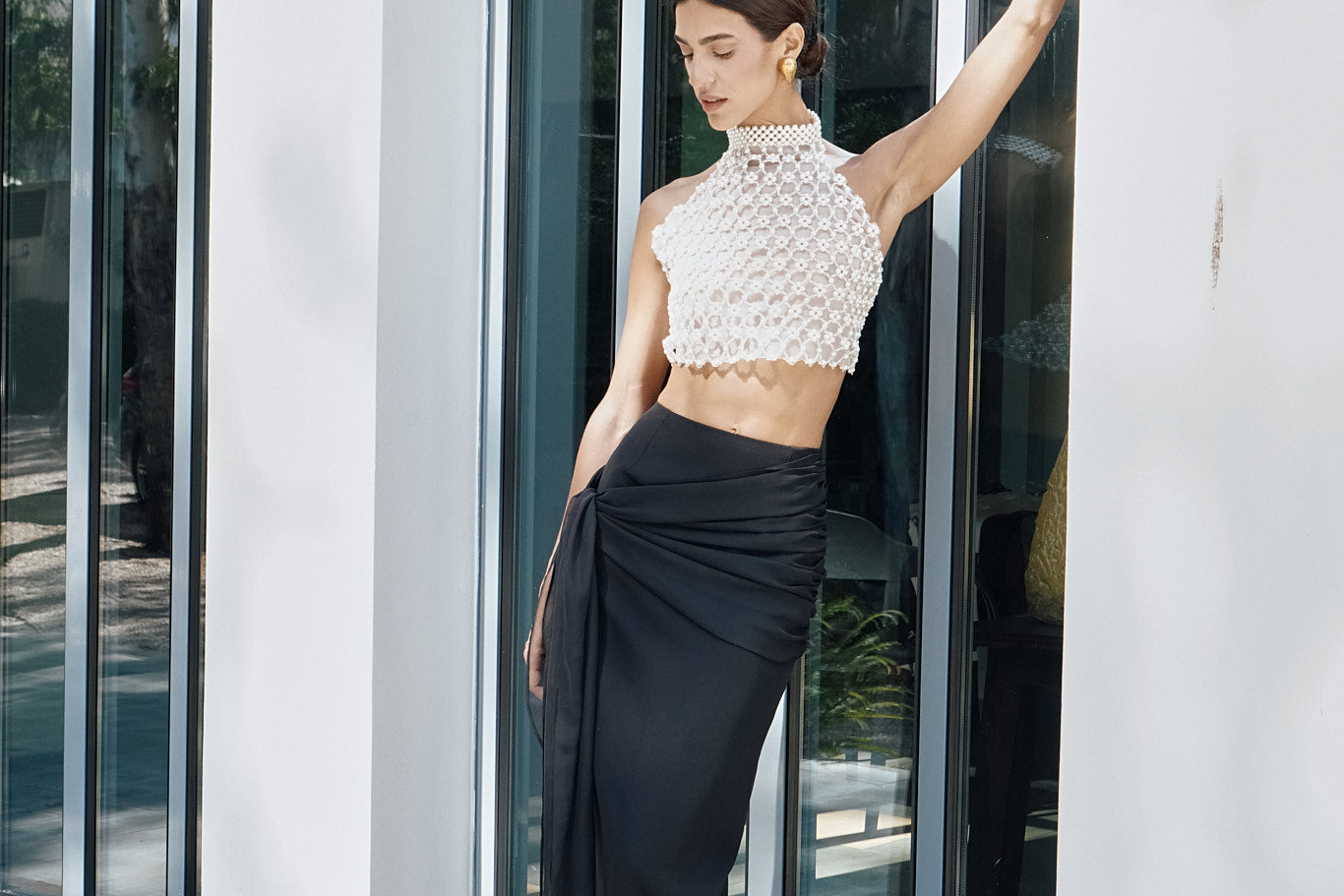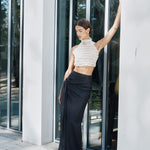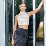 Our 'Adage' bustier features Vanina's signature beading technique. Entirely handmade in off-white acrylic and glass beads, it's a light and eclectic piece, sewn on an organza lining. It's the ideal statement to your wedding events! .