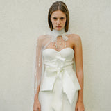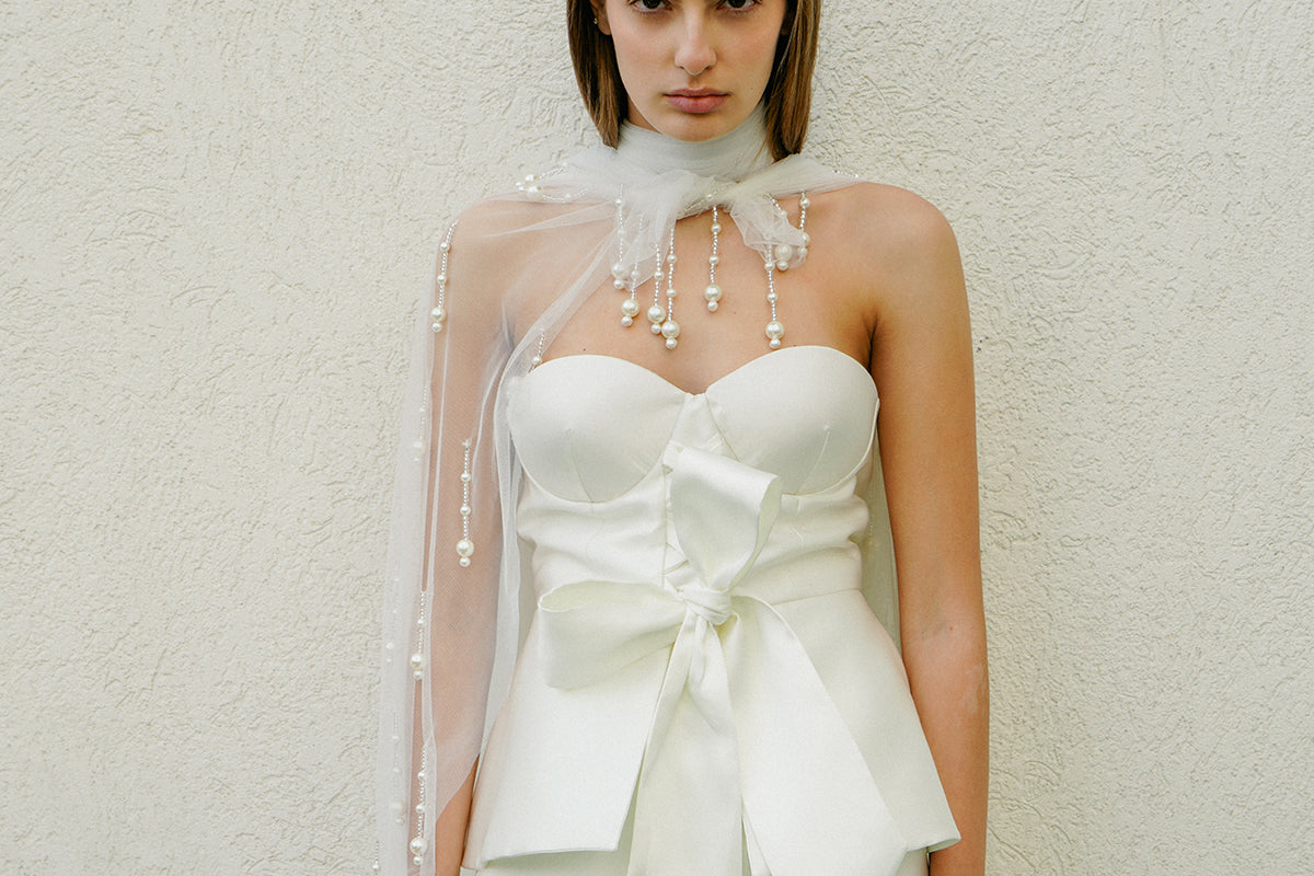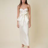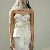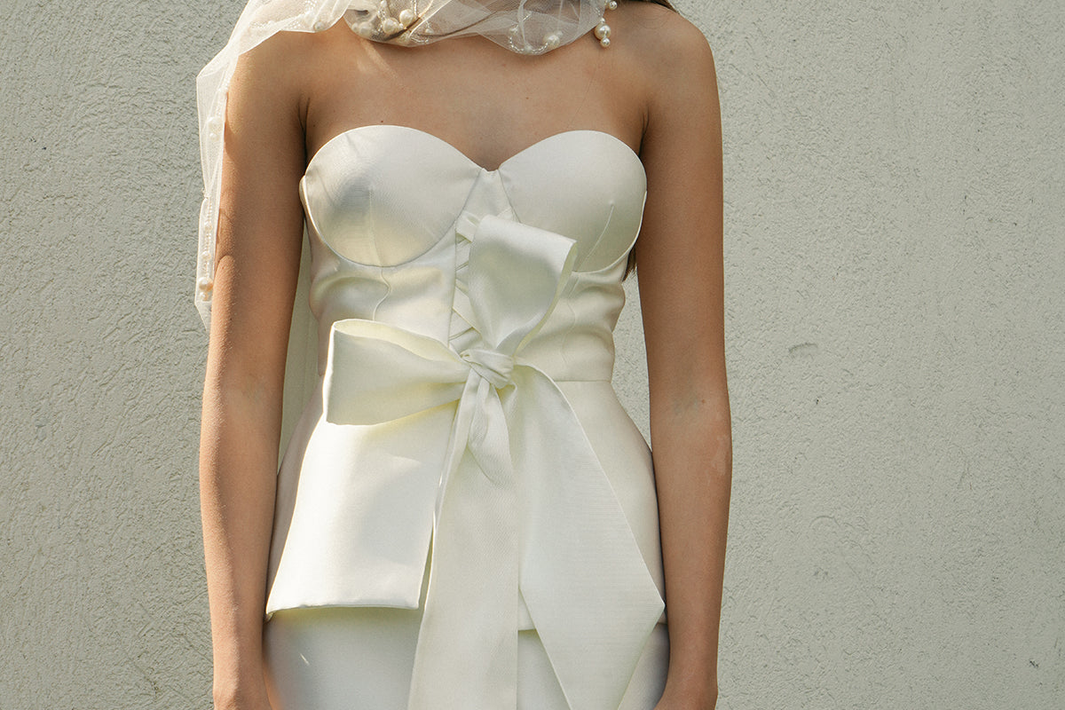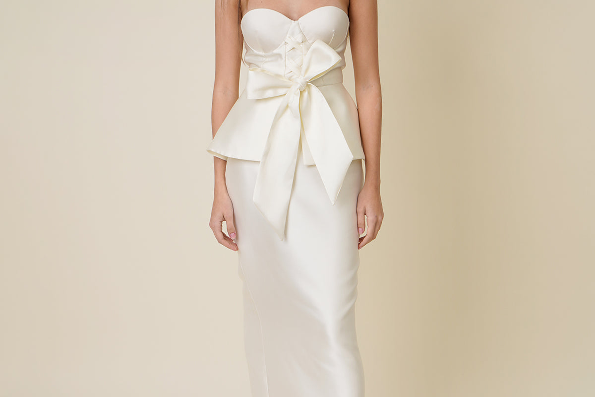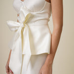 A romantic and structured bustier that will give your bridal look more dimension. It is made with a Mikado fabric with a bow and peplum details at the bodice.