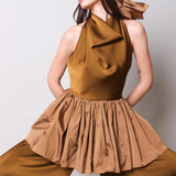 A versatile and fun piece that adds dimension to your outfit. The 'Parasol' bustier is a high-neck draped cut with an open back and a ruffled hem.