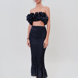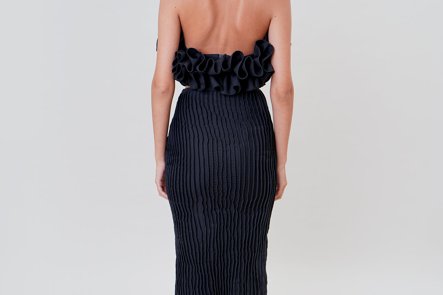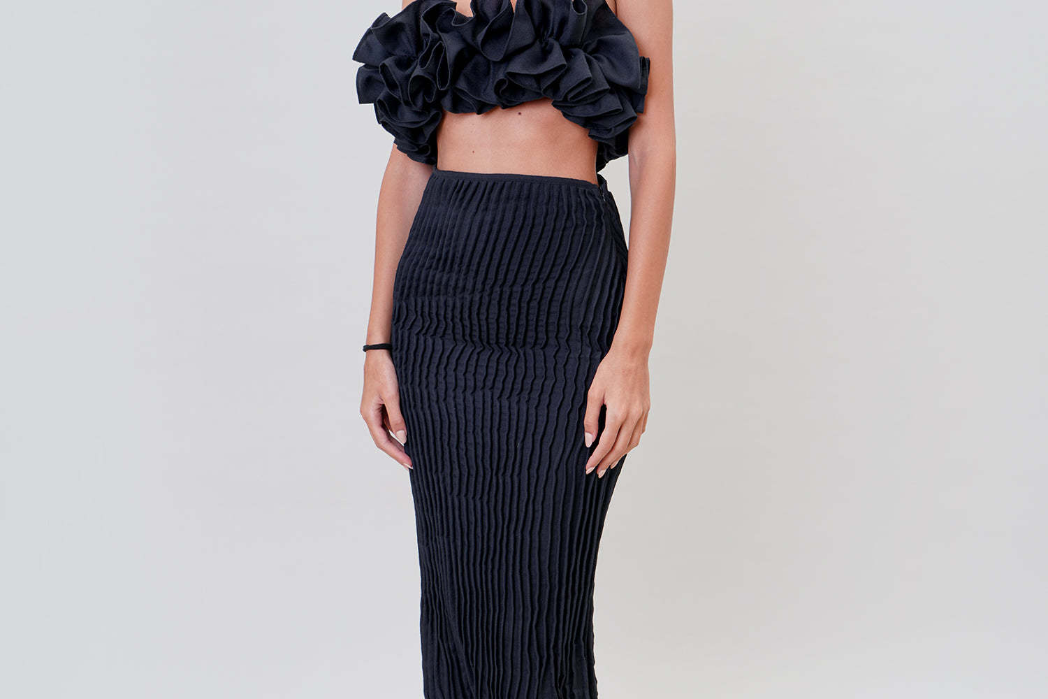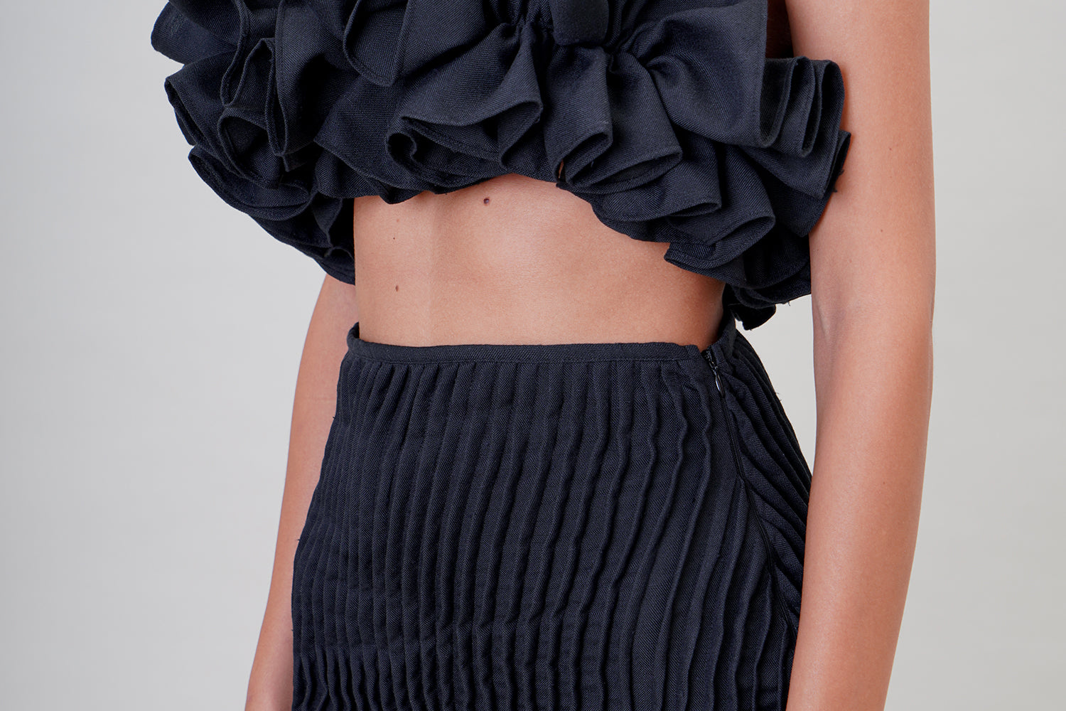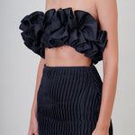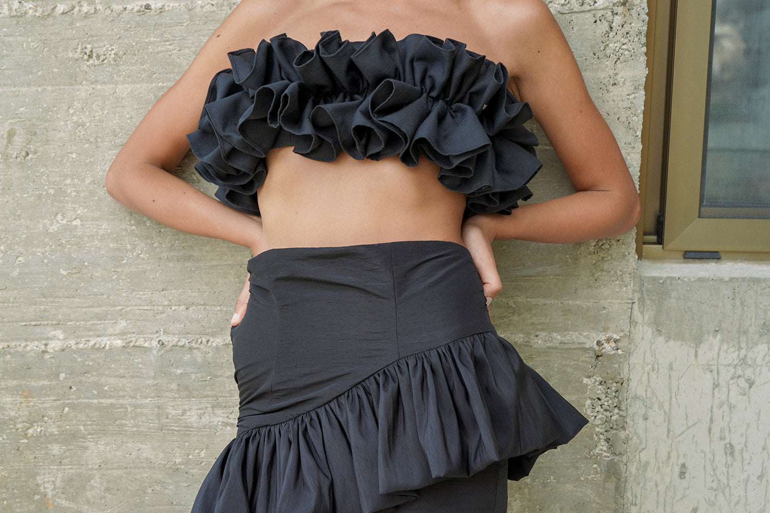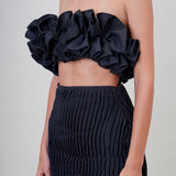 The must-have piece of the season. The sable chaud bustier is a very versatile piece entirely made with gathered ruffles.