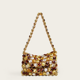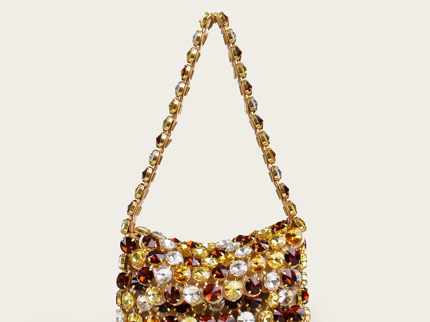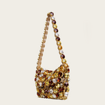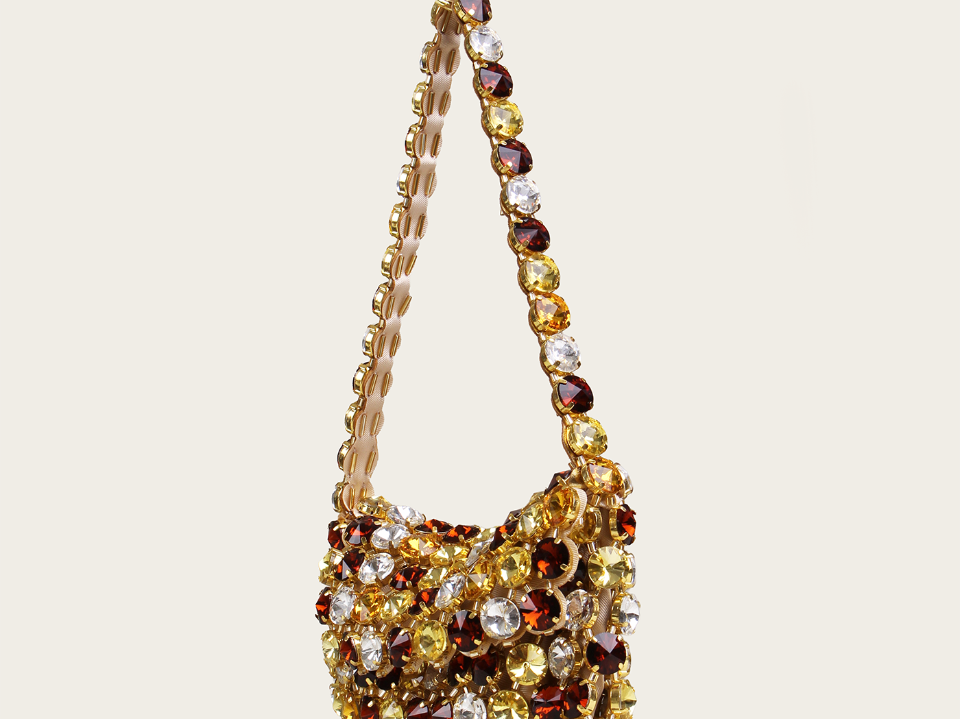 A statement piece entirely handmade with lustrous disc-shaped crystals and gold beads. With a phone case and baguette version, this dazzling piece is a definite show-stopper.