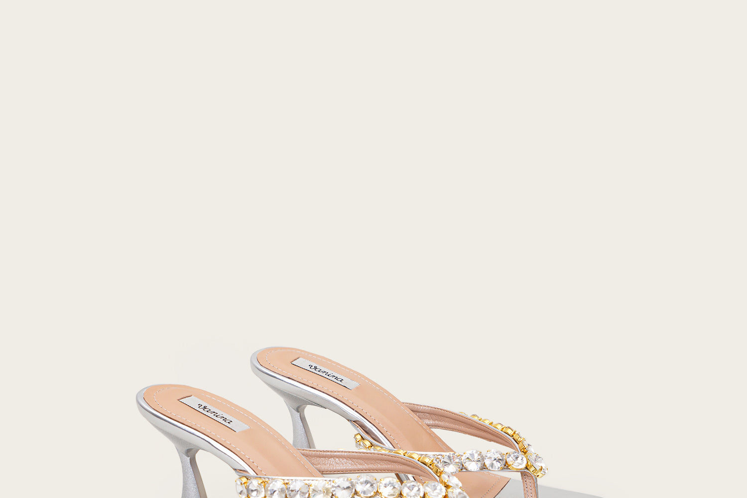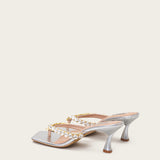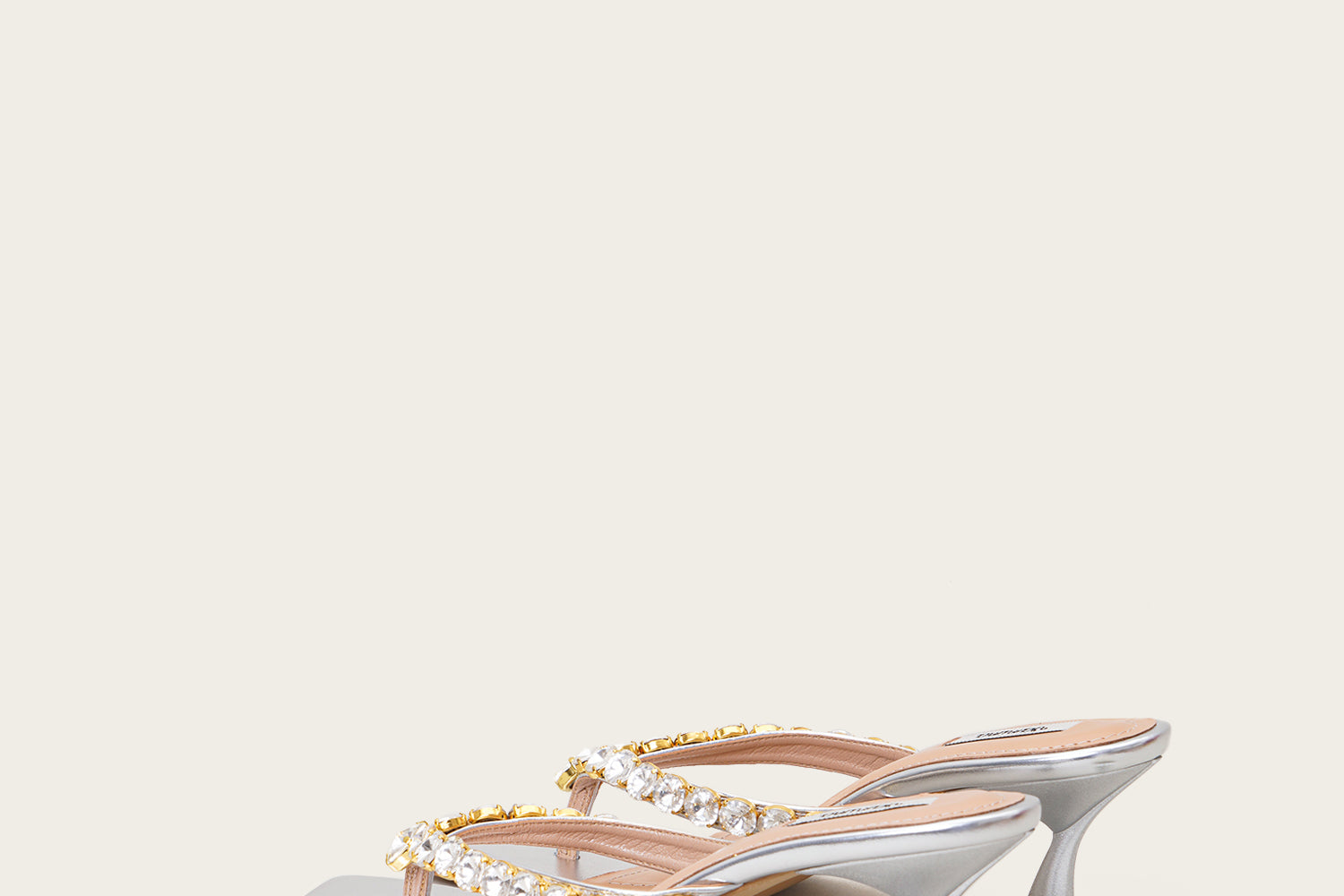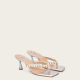 Slip into these gems for a glamorous night out! Our 'Clochette' open-toe sandals are fully embellished with dazzling crystals set on a 7cm geometric heel.