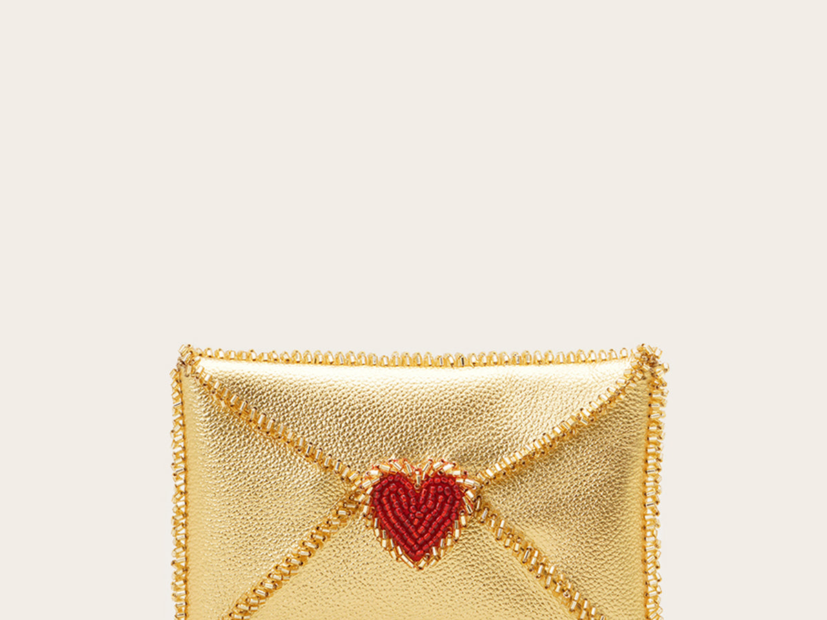 A love letter to carry you throughout the night. An envelope-shaped clutch with beaded edges, sealed with a magnetic closure topped with a bejeweled red heart.