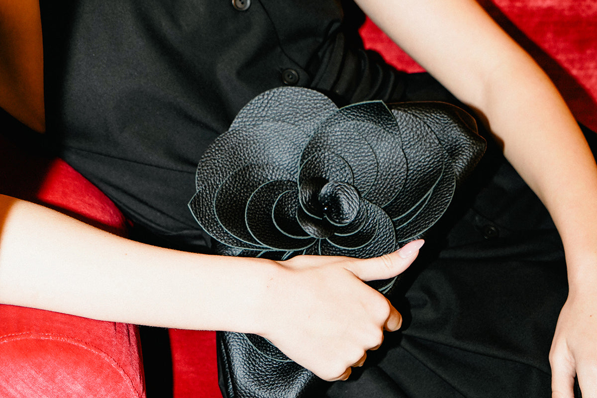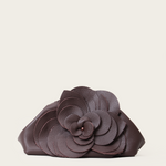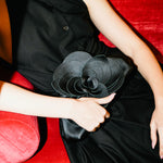 A spacious clutch with gathered fabric and a magnetic closure and adorned with an oversized handcrafted flower. Evoking a blooming rose, it brings the ultimate touch of romance and sophistication.