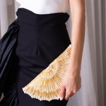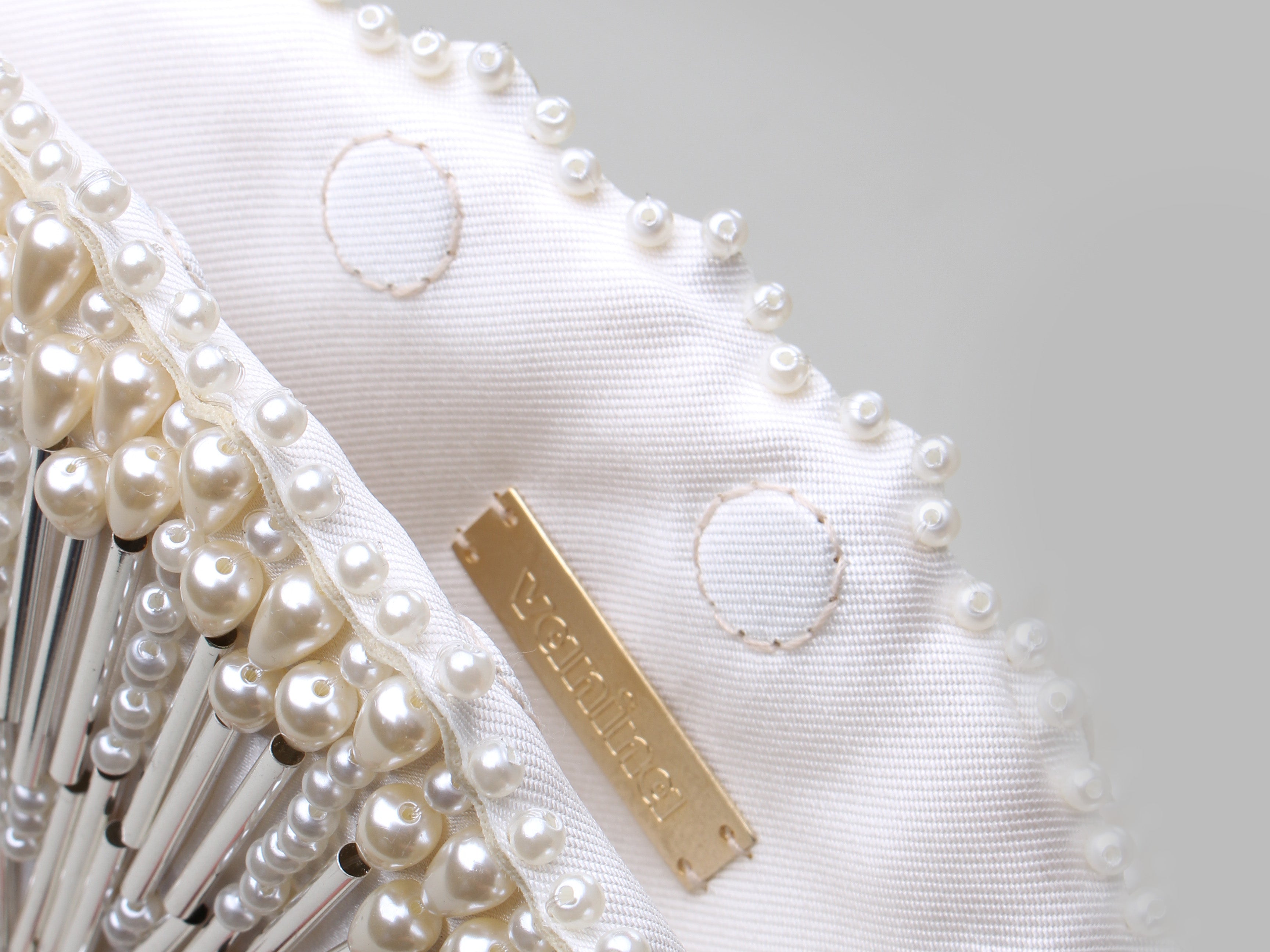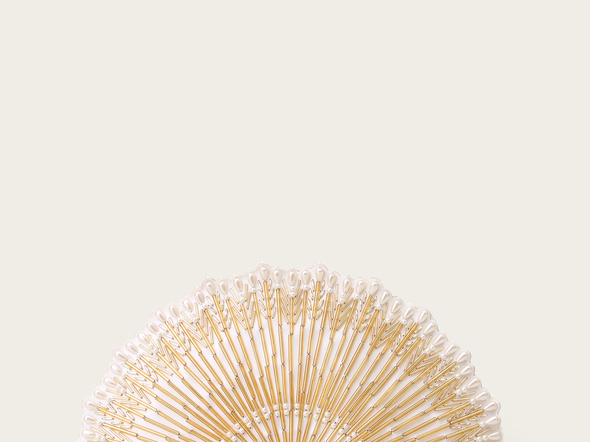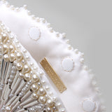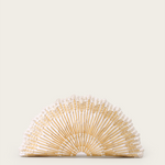 An arch-shaped evening clutch, handcrafted with delicate pearls of various shapes, with a sleek magnetic closure. Its intricate silver and gold beading creates a subtle, radiant sparkle, perfect for an elegant touch.