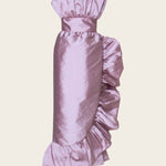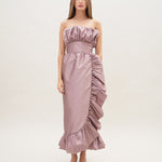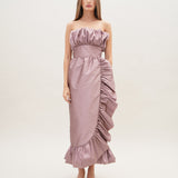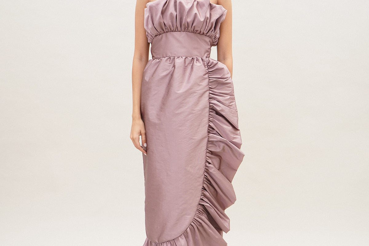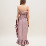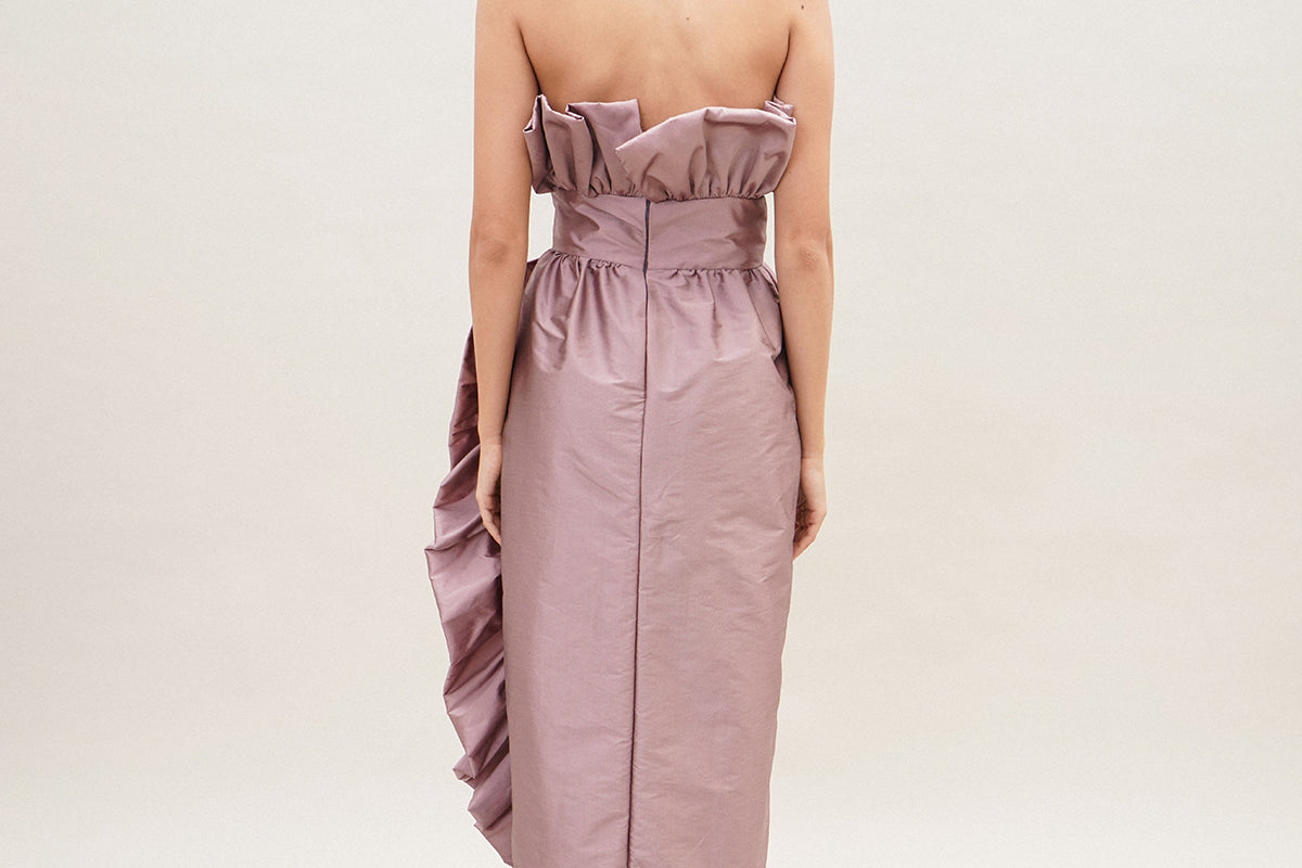 A strapless mid length silhouette with detailed rushing on the bust and hemline with a cinched waist for the most romantic look.
