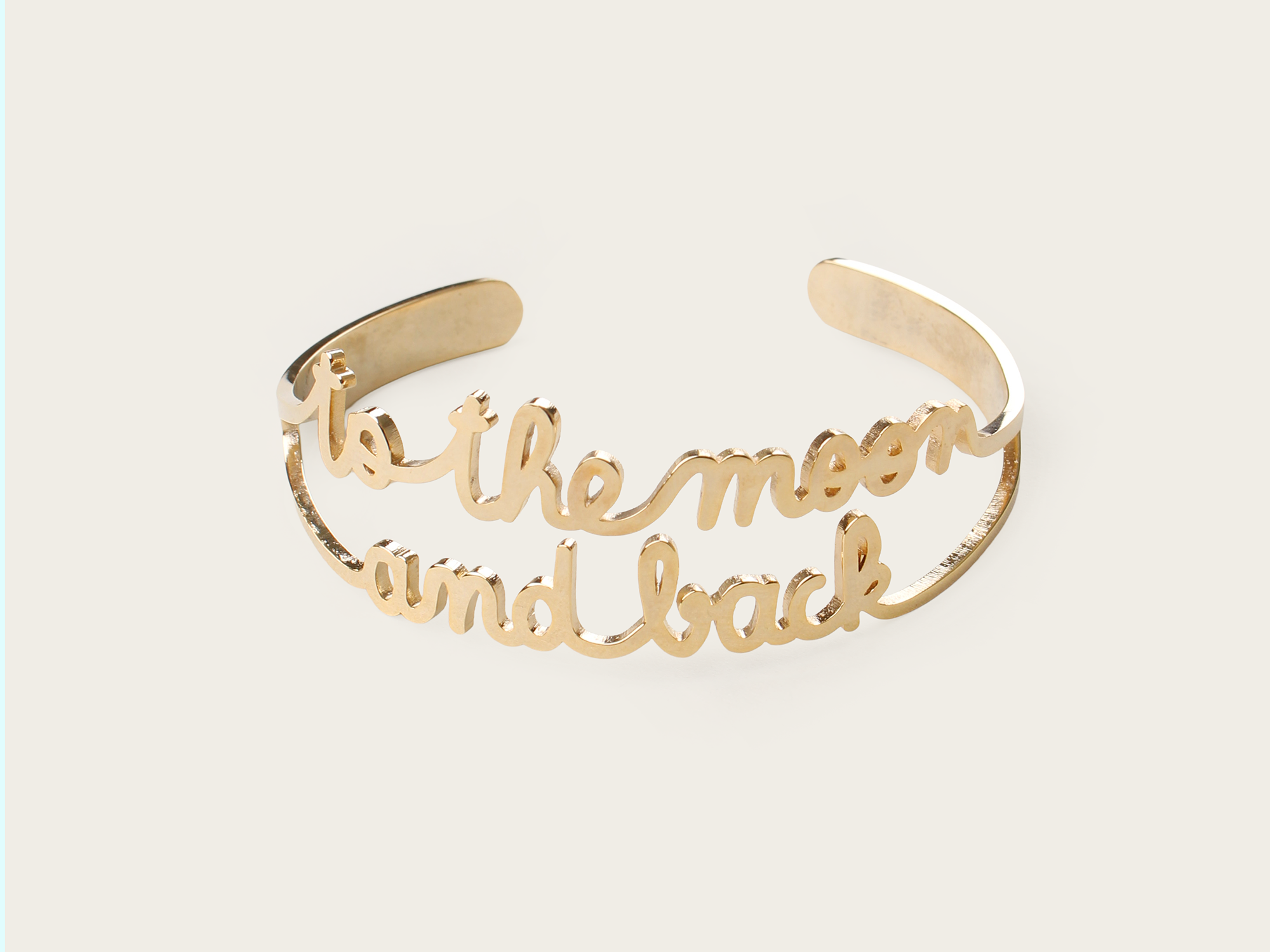 'To the Moon and Back' open bracelet will add a playful statement to your look. This piece is easily adjusted to your wrist.