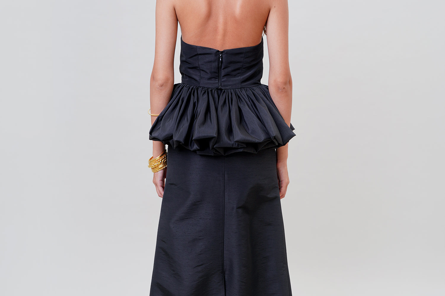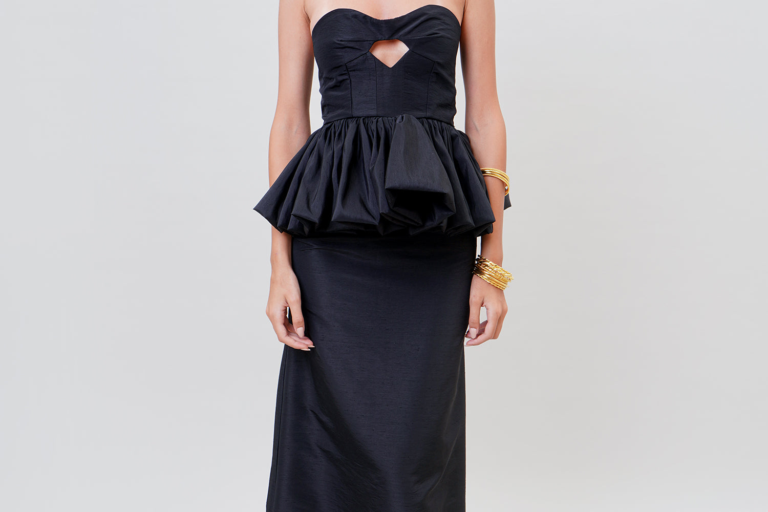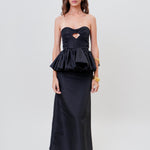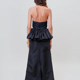 A bold and statement piece for the winter. It's a strapless silhouette with an angular ruffled hem and a cut-out under the bust. Style it with the matching 'Lula' skirt.