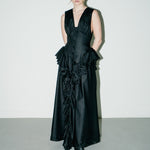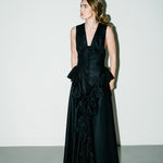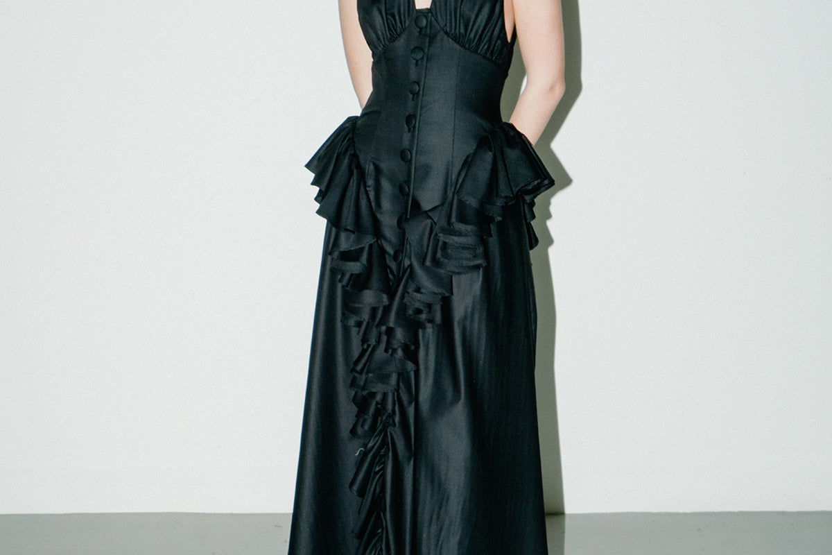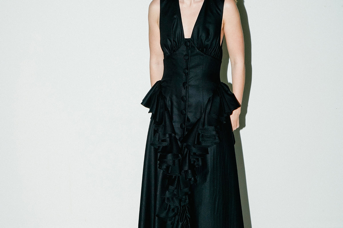 A refined and timeless piece that fit every occasion. Featuring a deep V-neck on the front and back, this piece is accentuated by buttons and gathered ruffles around the bodice.