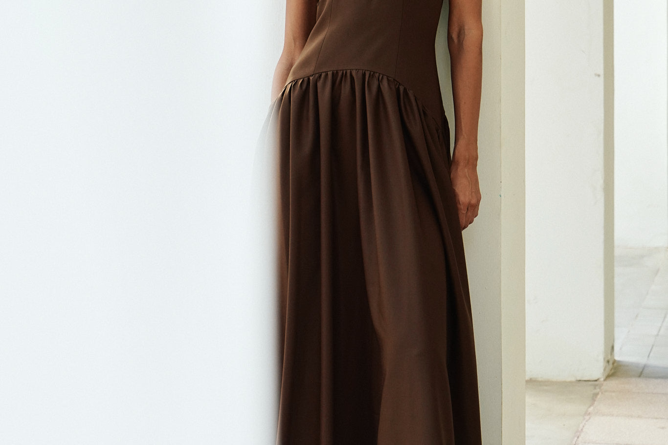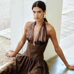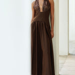A refined piece that exudes elegance and grace. Featuring halter-style straps made in a lamé voile material, this dress is accentuated by a fitted bodice and a pleated bell-shaped skirt.