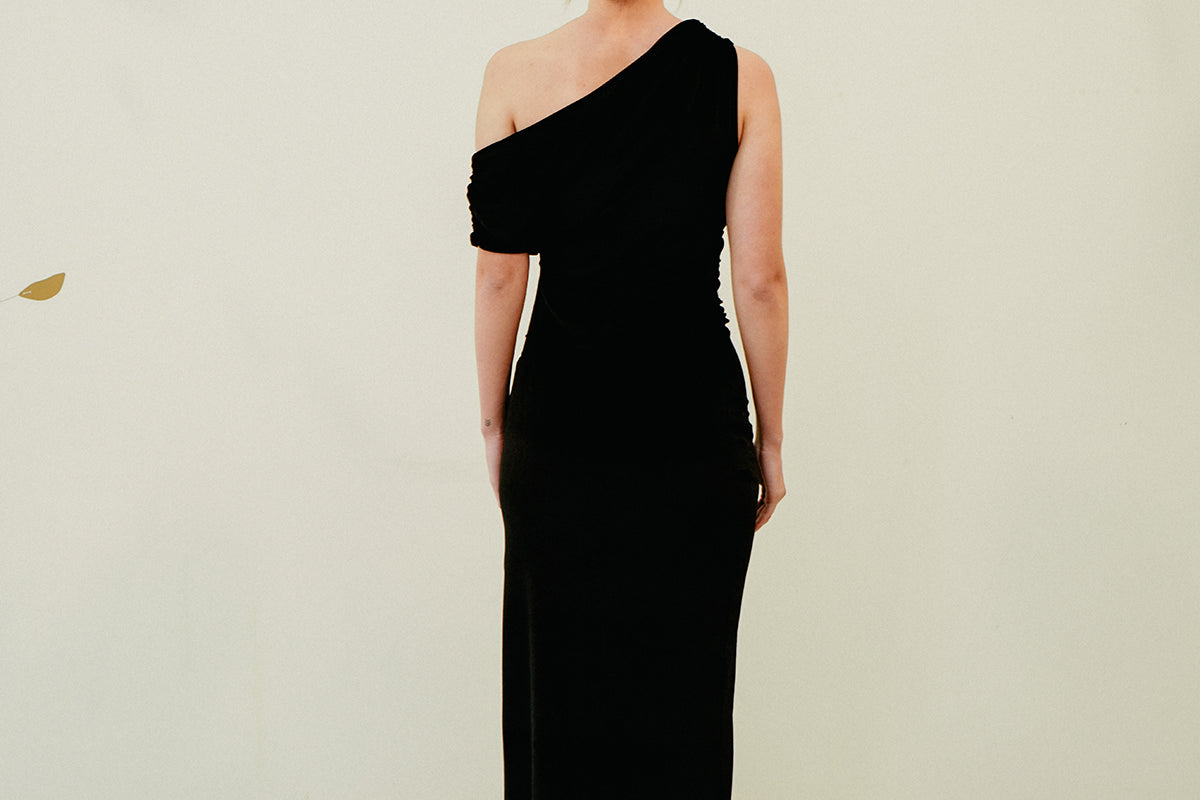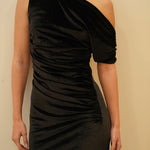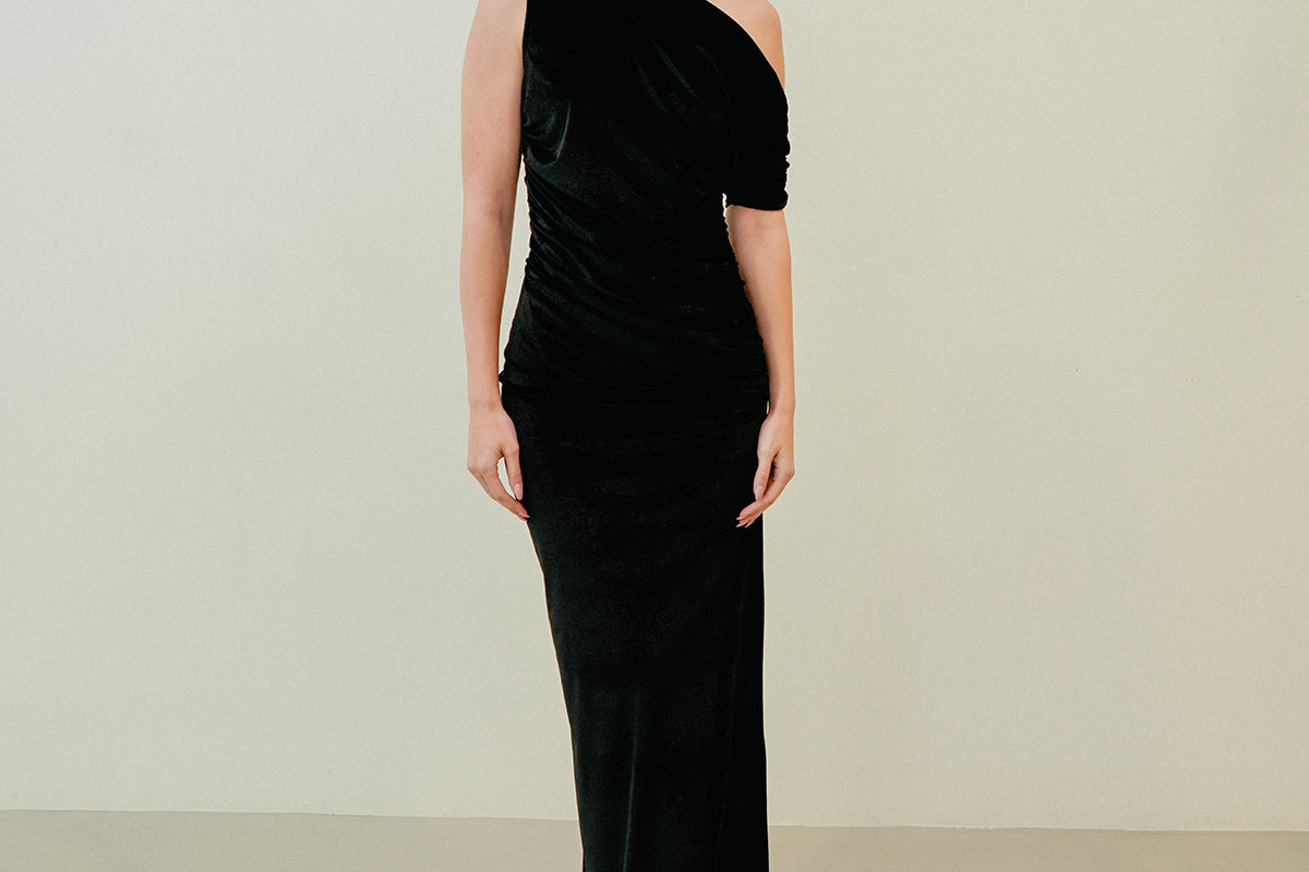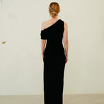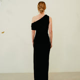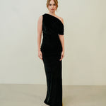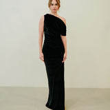 This dress offers a sleek, long, straight silhouette, crafted with light velvet material. Its standout feature is the asymmetric neckline, beautifully complemented by a gathered draping effect around the bodice.