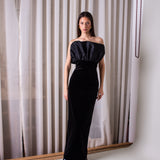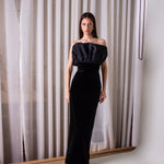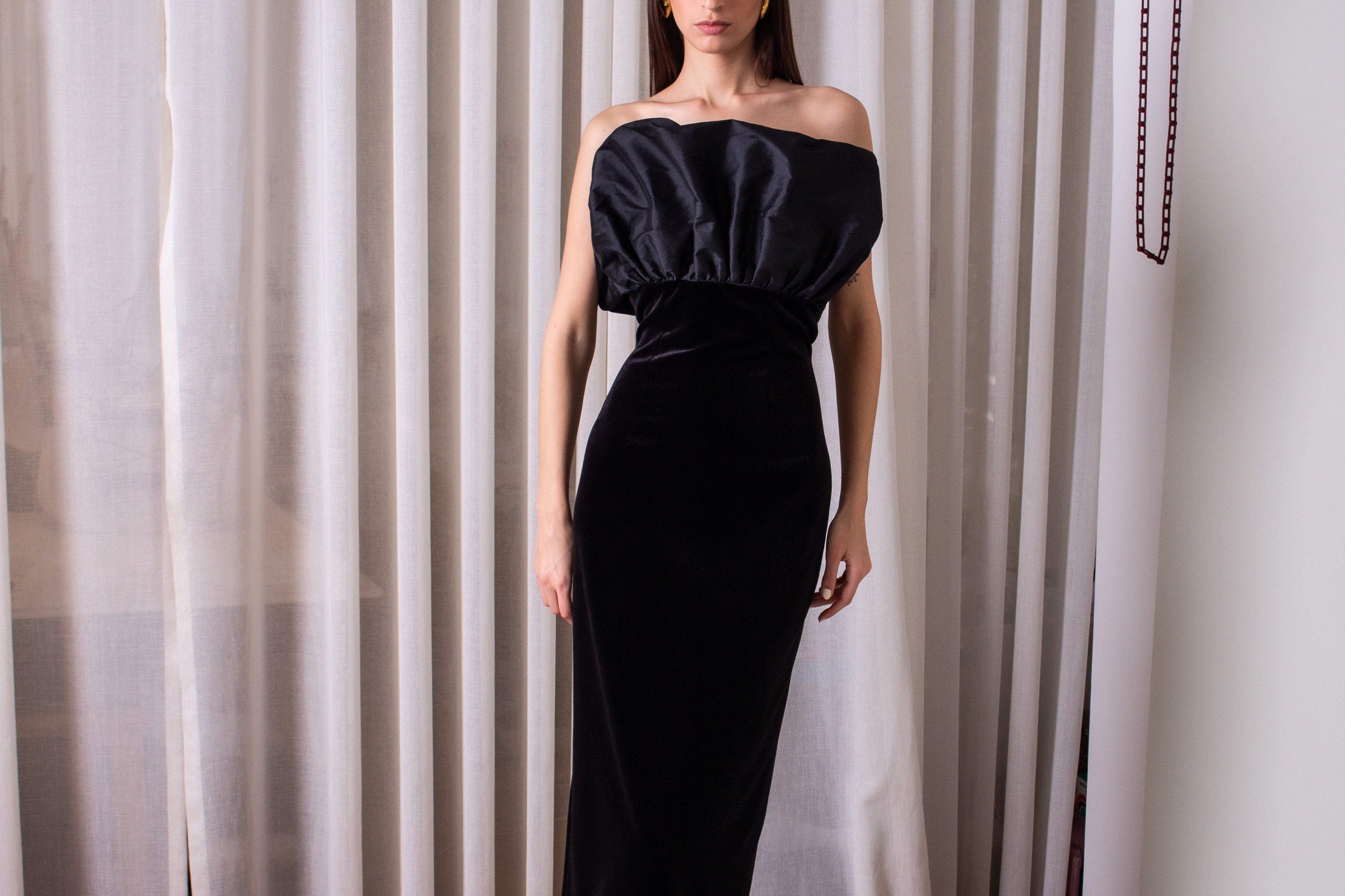 Inspired by the beautiful shapes of nautical creatures, our 'Shell' dress is this season's most elegant cut. With a pleated accordeon-like bust, it is completed with a straight silhouette.