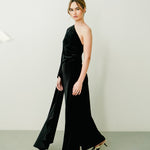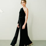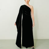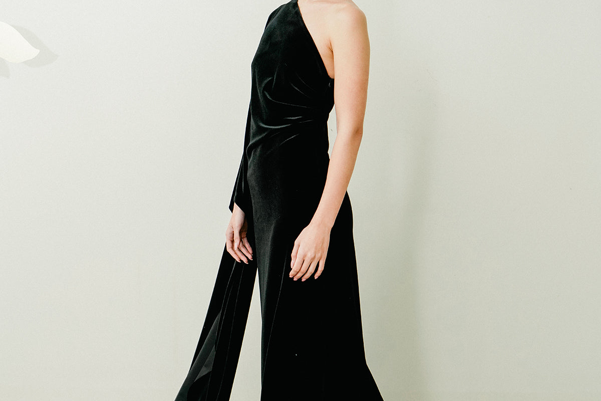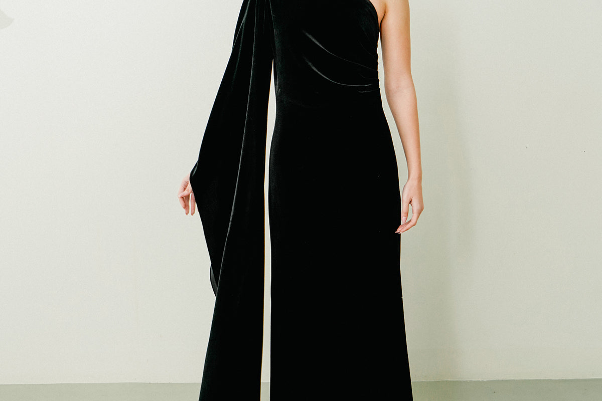 A mono-bell sleeve tunic dress is cut from a soft velvet fabric. The dramatic one-shoulder silhouette and gathers on the side create a balanced asymmetry.