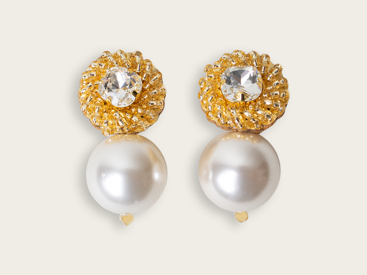 The 'Fleur Solaire' clip-on earrings feature a dazzling crystal surrounded by gold beading with a twisted pattern and completed with adorned oversized beads.