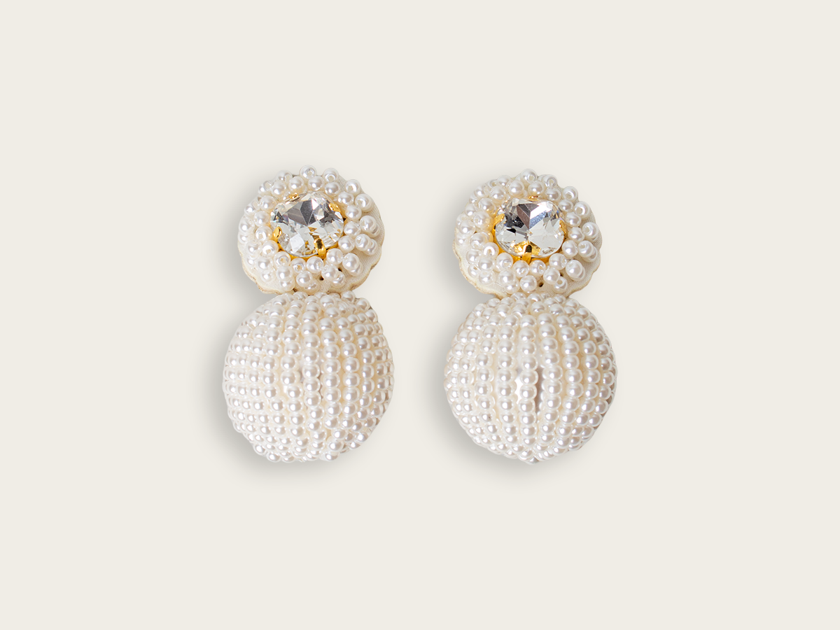 For a modern take on studs, the 'Fleur Solaire' clip-on earrings feature a dazzling crystal surrounded by pearl beading with a twisted pattern.