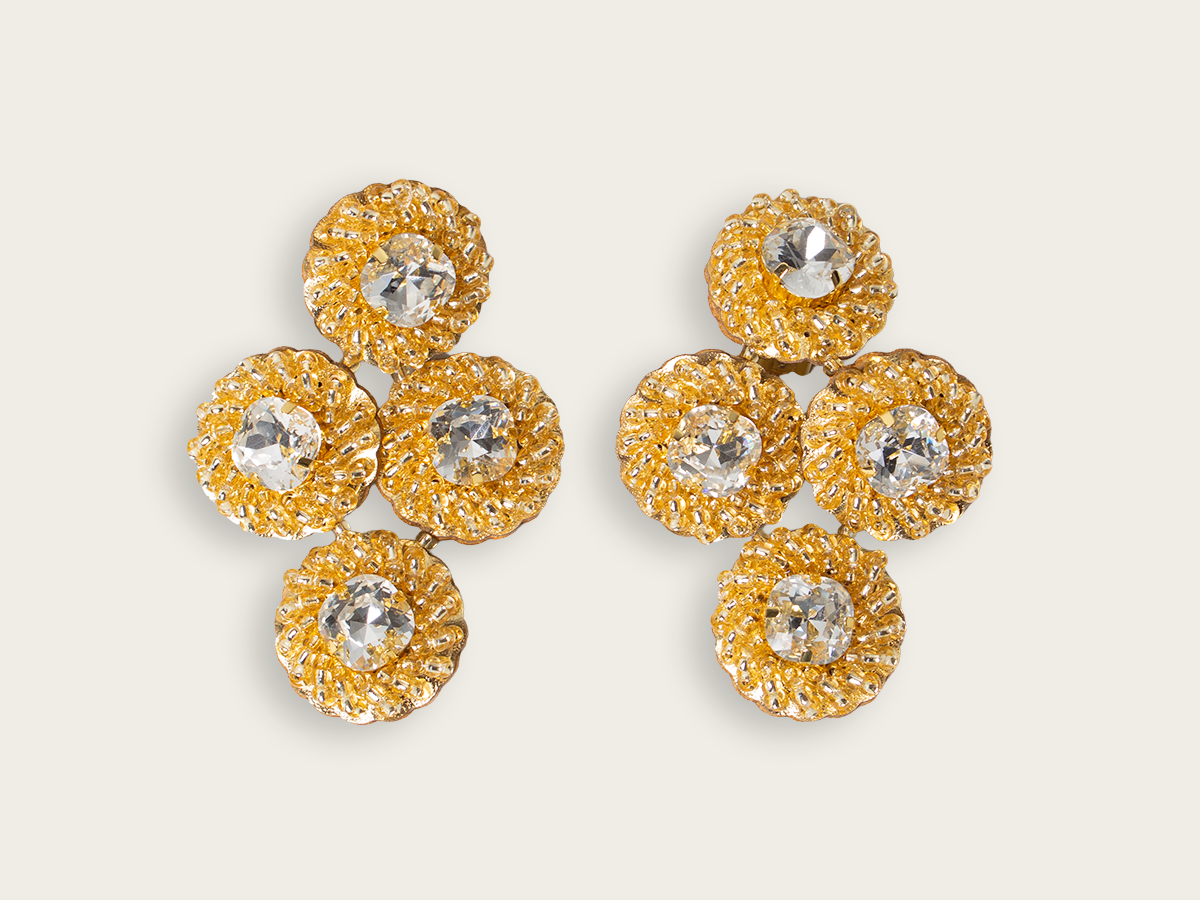 The 'Fleur Solaire' clip-on earrings feature a dazzling crystal surrounded by gold beading with a twisted pattern and completed with adorned oversized beads.