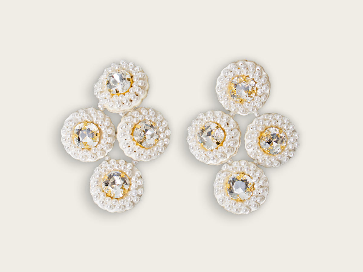 The 'Fleur Solaire' clip-on earrings feature a dazzling crystal surrounded by pearl beading with a twisted pattern and completed with adorned oversized beads.