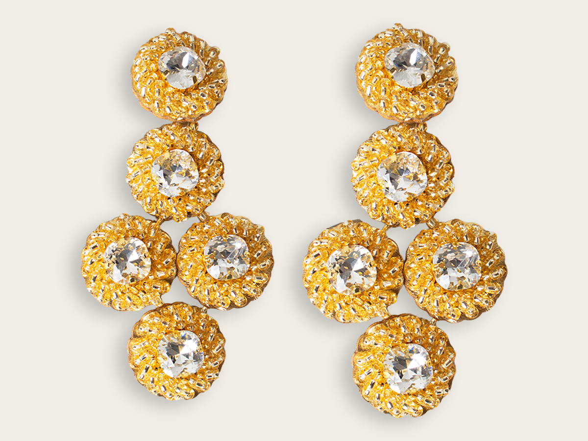 Make the ultimate statement with the latest 'Fleur Solaire' clip-on earrings. A cluster of dazzling crystals surrounded by gold beading with a twisted pattern.
