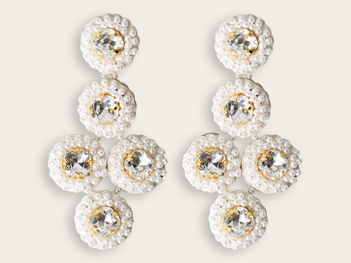 Make the ultimate statement with the latest 'Fleur Solaire' clip-on earrings. A cluster of dazzling crystals surrounded by pearl beading with a twisted pattern.