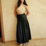 Meet our latest 'Gondole' skirt, a statement skirt cut from silk taffeta. Draped at the waist and flared hem, it has a dramatic allure and moves beautifully as you walk.