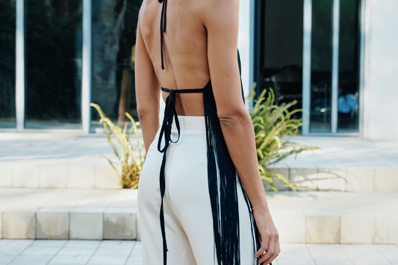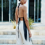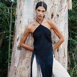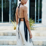 A versatile day-to-night top with an effortless feel. A classic haltertop silhouette with an open back and dangling silk fringes on the bodice.
