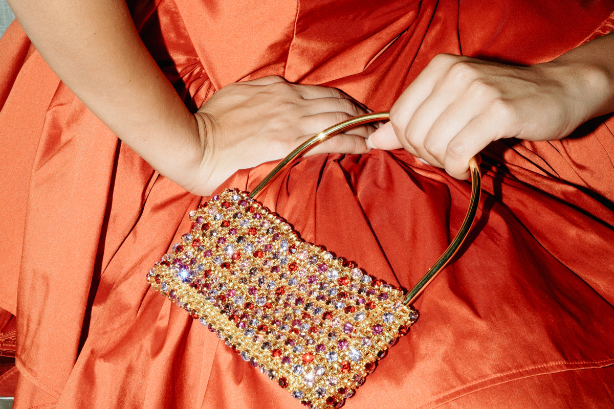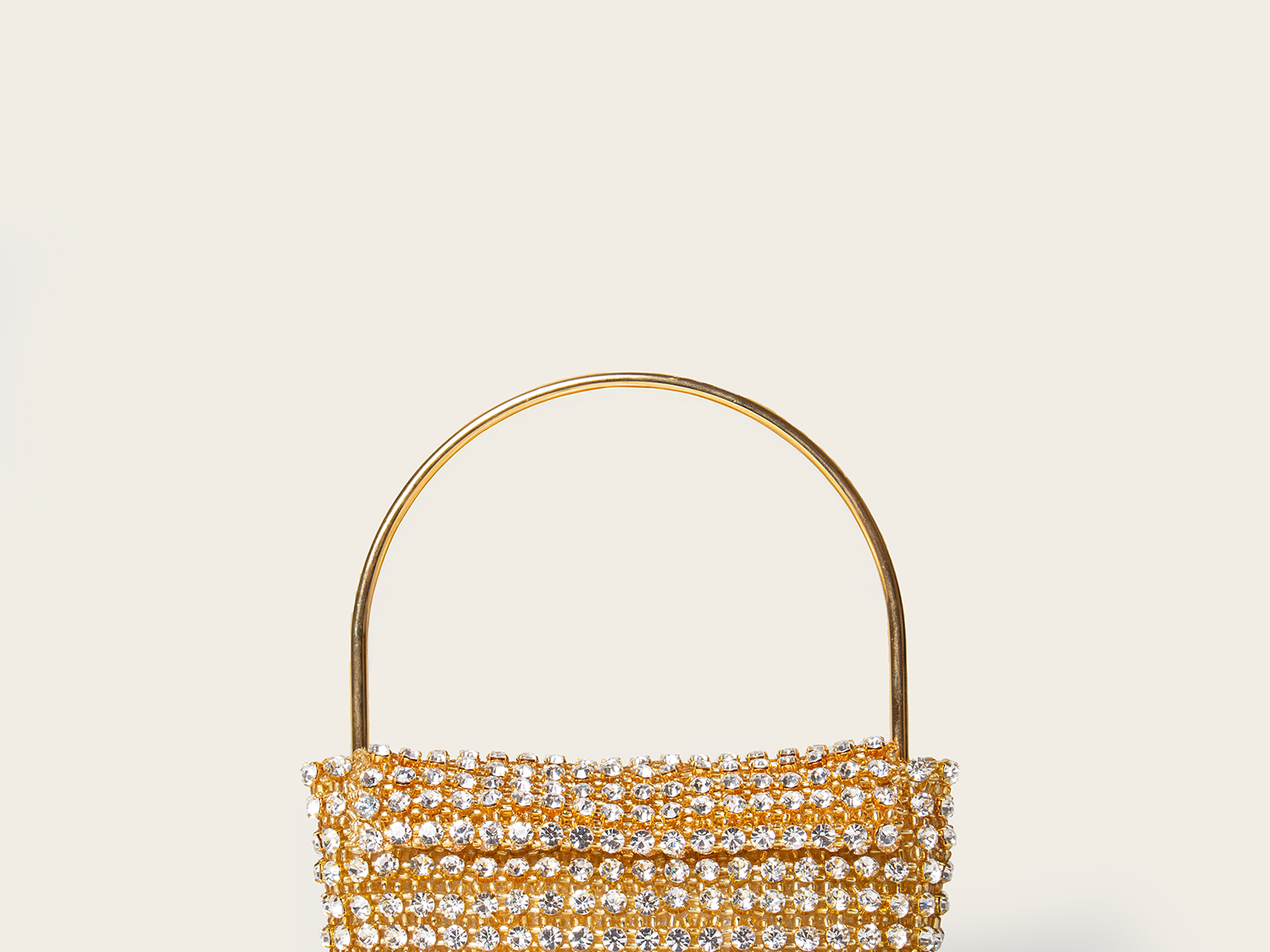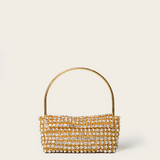 Our latest version of the 'Diademe' collection come in a wider baguette shape. It is fully handcrafted with Swarovski crystals, with a flap closure and a gold-plated handle.