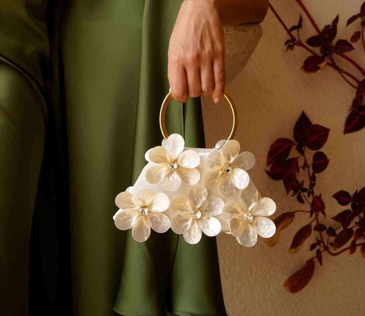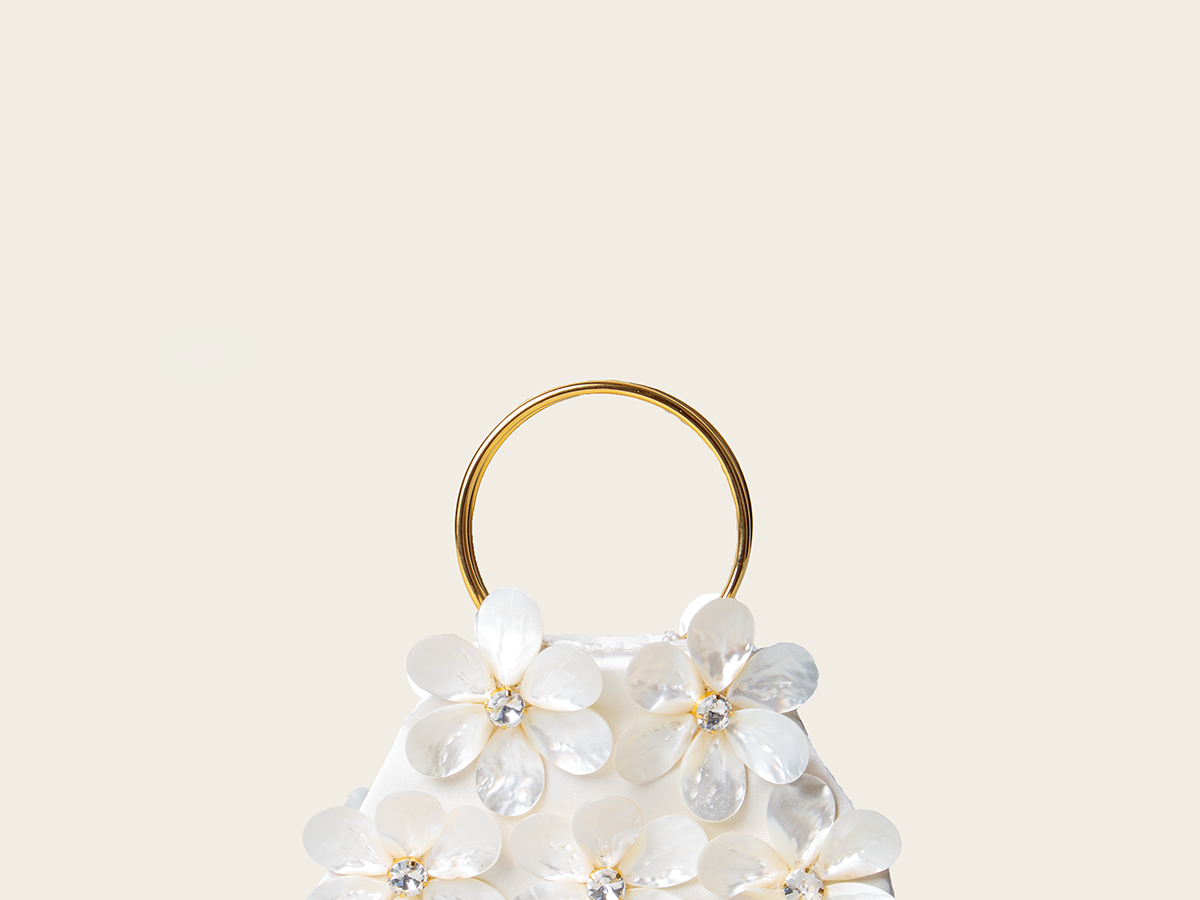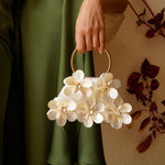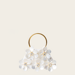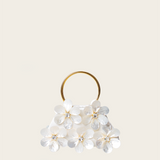 Introducing our Fleurs Blanches bag, handcrafted with mother-of-pearl shells blooming around sparkly crystals and featuring a resin handle. With its intricate three-dimensional texture, this bag adds a touch of shimmery romance to any outfit.