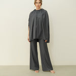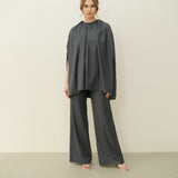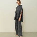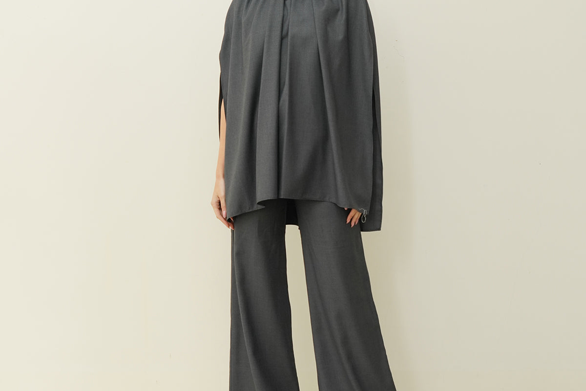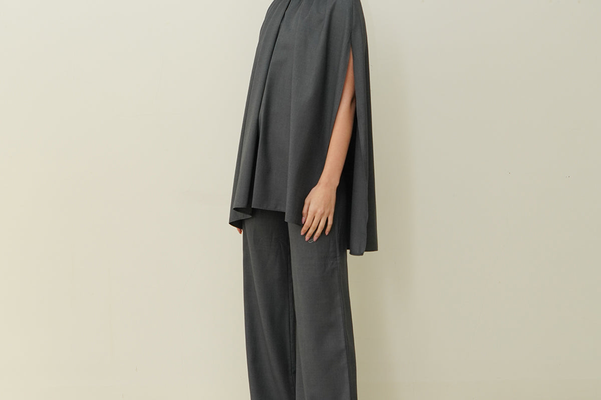This versatile set features a modern design with a playful touch. The top is an oversized, draped cape-like piece that gathers at the neckline, creating soft, voluminous folds that flow elegantly.