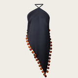A halter-top with asymmetric detailing, adorned with oversized tortoise beads and a completely open back. It is tied around the neck and back with drawstrings.