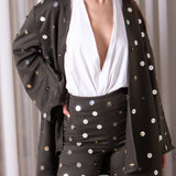 This eclectic set features a size-free relaxed kimono and cropped pants with a slight flare. It is fully embellished with silver sequins and gold beads.