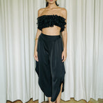 An effortless piece for your summer evenings. With a relaxed waistband, the ‘Sarwel’ comes with an angled midi silhouette, with long side slits.