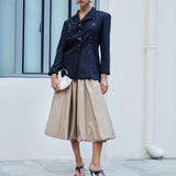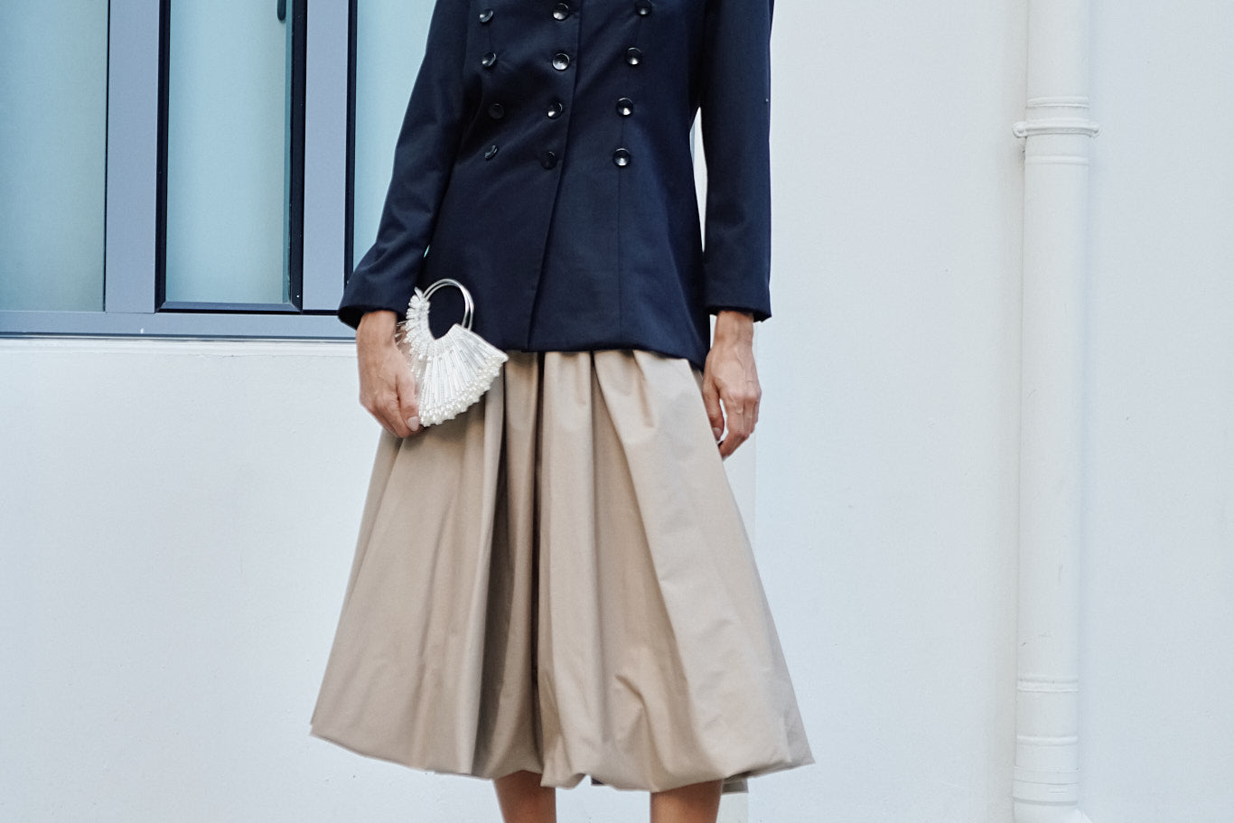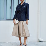 A piece to be carried throughout the years; A midi silhouette with pleats and a balloon hem.