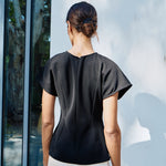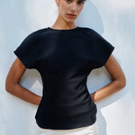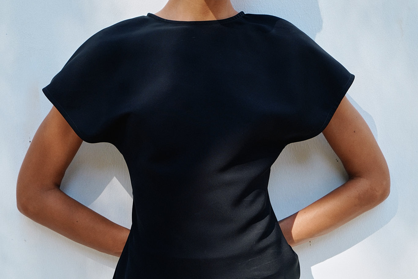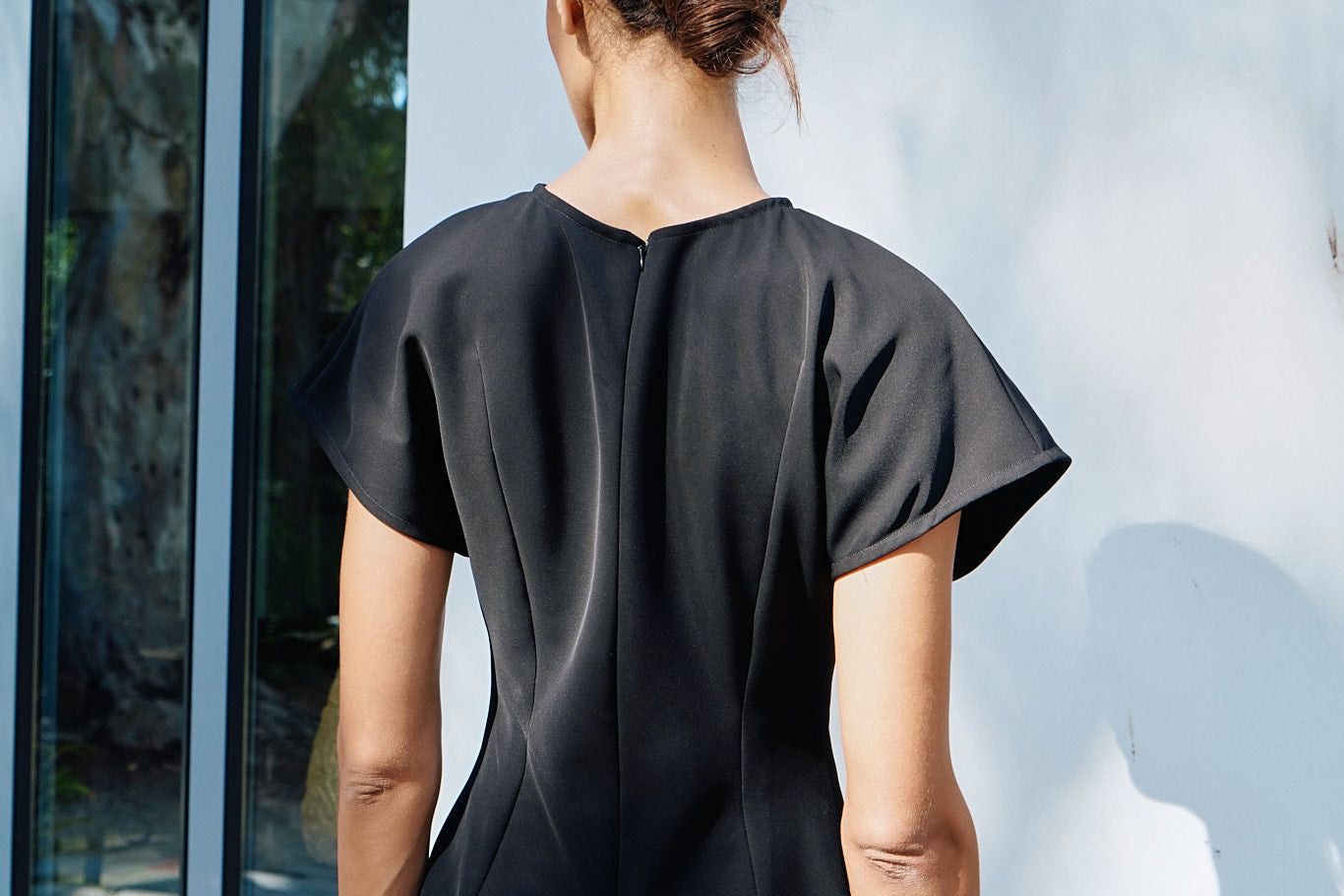 A chic and effortless silhouette with a mock neck, an accentuated waist and a light peplum detail.