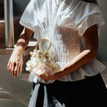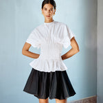 A structured piece that adds an edge to your looks. It features cap-style short sleeves with intricate pin-tuck details at the bodice, with a slight flare at the hem.