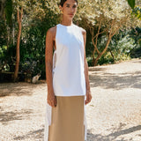 A versatile day-to-night top with a high neck and open sides. They are adorned by two rows of straps that can be tied in a knot.