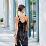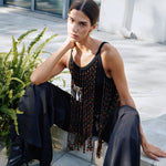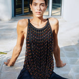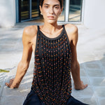 A versatile tank top with a twist. It is fully adorned with long cascading beads that move with you as you go.